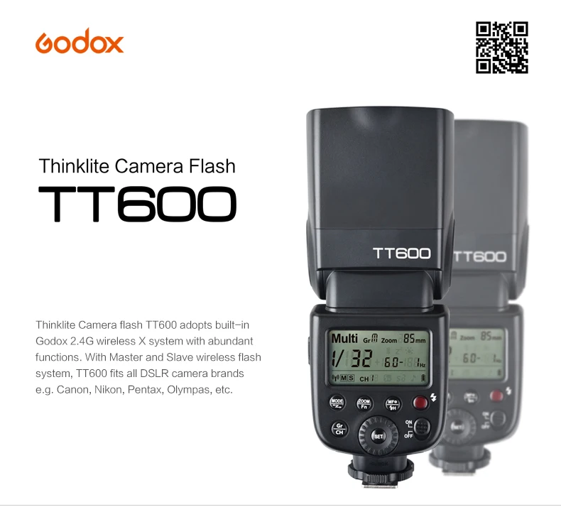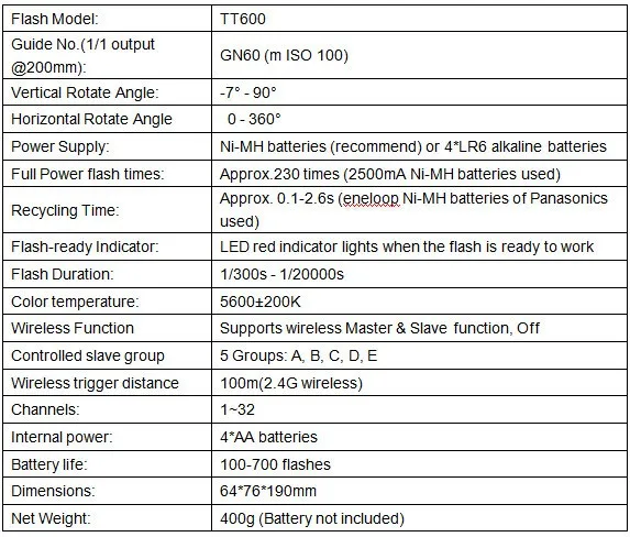 -Принимает Godox беспроводной x-системы, со встроенной 2,4G беспроводной передачи, может использоваться с Godox AD360II-C/AD360II-N, TT685C/TT685N, X2T-C/X2T-N беспроводной системы управления. -Встроенная беспроводная передача 2,4G с функциями «все в одном» и дальнейшей передачей 100 метров, чтобы предложить Вам стабильный выход и креативный светильник. -Улучшенная производительность: больше времени вспышки, approx.230 мигает полной мощностью (с использованием аккумуляторов Ni-MH 2500mA), обеспечивает достаточно времени вспышки для вашей съемки. -Более быстрое время рециркуляции: 0,1-2,6 s время рециркуляции при полной мощности (с использованием eneloop ni-mh батарей Panasonics). -Даже светильник освещения: GN60 (м ISO 100) Высокое Ведущее число фотовспышки, 1/300s - 1/20000s короткие длительностью вспышки, 5600 ± 200K стабильной цветовой температурой. -ЖК-панель большого размера обеспечивает четкую и удобную работу. -При использовании с беспроводным триггером вспышки X2 TTL (продается отдельно), может удаленно запускать вспышку TT600 и управлять ручным выходом, предлагая лучший пользовательский опыт. -Высокоскоростная синхронизация (HSS): может осуществлять высокоскоростную синхронизацию при использовании с триггером Godox Cell-II или беспроводным триггером X2C/X2N TTL (продается отдельно), максимальная скорость может достигать 1/8000s (зависит от камер). Особенно удобно при использовании диафрагмы для заполнения вспышки на портрете. Обратите внимание: TT600 не может реализовать HSS при использовании на камере горячий башмак. -Поддержка режимов M /S1/ S2, автоматическое/Ручное Масштабирование 20-200 м. -С настраиваемыми настройками функций C.Fn. -С функцией автоматической защиты от перегрева вспышки.