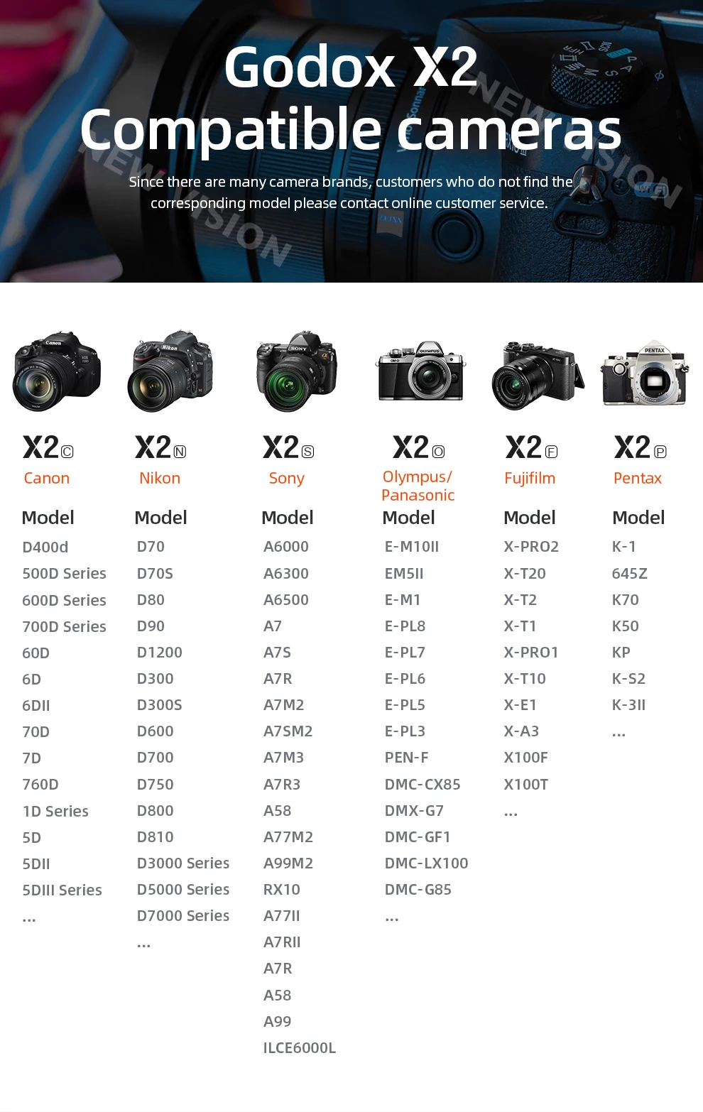 Модель: X2T-C Конкурентоспособная камера s:Canon EOS Camera (E-TTL II autoflash) , работает с камерой s с разъемом для синхронизации ПК Конкурсный мобильный телефон: Iphone 6S,iphone 6s Plus, iphone 7 Plus, iphone 7, iphone 8 Plus, iphone 8,iphone 6,iphone 6 Plus, iphone X; Huawei P9,P10,P10 plus,P20,P20 pro,Mate 9pro,Mate 9,Mate 10pro,Mate 10, Samsung: galaxy S8,galaxy Note8,galaxy S9 В этой таблице приведены только протестированные модели смартфонов, а не все. Для совместимости других моделей смартфонов рекомендуется Самостоятельная проверка.