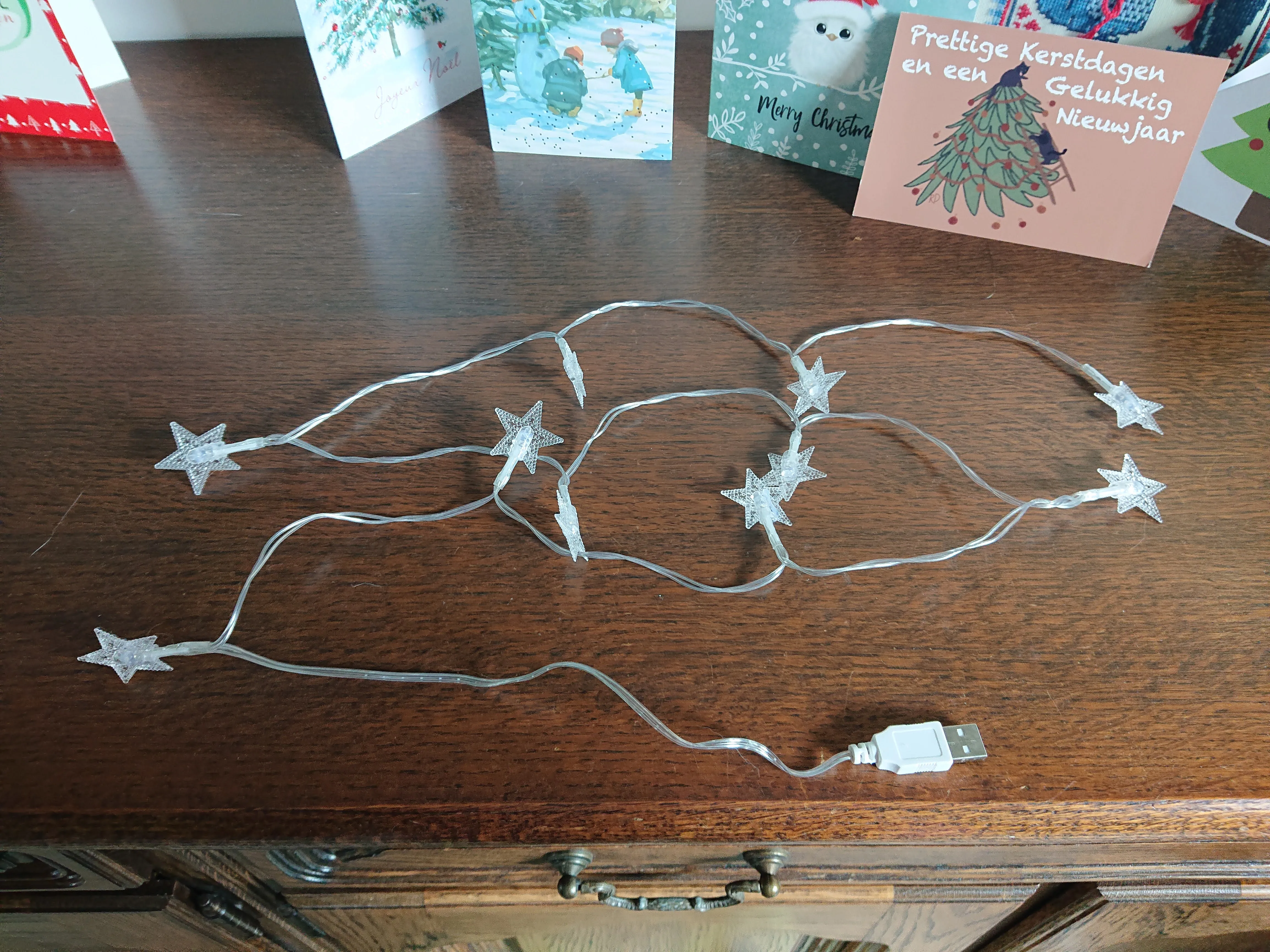 Product is as described and works. I would've preferred if there was more length of cable between the first star and the USB connector so it'd be easier to reach a socket. But no worries, that's what extender cables are for :)
