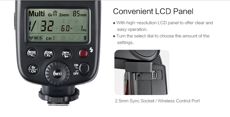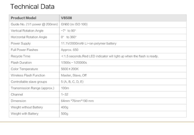 Godox V850II GN60 Встроенная 2,4G Беспроводная система X 1/8000s HSS Вспышка Speedlite для камеры Canon Nikon Pentax OlympusВспышка Godox Li-Ion V850II гарантирует лучший светильник со встроенной беспроводной системой Godox 2,4G. С системой беспроводной вспышки Master И Slave V850II подходит для всех брендов dslr-камер. Например, для Canon, для Nikon, для Pentax, для Olympus и т. д.Особенности:Оптическая беспроводная передача 2,4G обеспечивает равномерный и стабильный выход. Со встроенной беспроводной системой Godox 2,4G X V850II совместим с AD600, AD360II-C, AD360II-N, TT685C, TT685N, X1T-C, X1T-N и т. д. В режиме беспроводной передачи 2,4G, при использовании в качестве основного блока, V850II может установить свою группу как M/a/B/C/D/E; При использовании в качестве невольного блока, V850II может установить свою группу как A/B/C/D/E. Есть 1-32 канала для выбора.Используя беспроводную систему Godox 2,4G X, V850II может срабатывать только с помощью передатчика X1T-C или X1T-N (продается отдельно). V850II также может достичь высокоскоростных функций синхронизации 1/8000s при срабатывании Godox cells II, X1T-C, X1T-N-передатчика. Оснащена беспроводным управлением с помощью порт и 3,5 мм Кабель Синхронизации, V850II имеет несколько всплывающие предупреждения на методы.Мощный и удобный литий-ионный аккумулятор: макс. 1.5s время рециркуляции и 650 Попов полной мощности. Литиевые батареи емкостью 2000 мАч обеспечивают лучшую производительность при съемке.GN60(m ISO 100, @ 200 мм), 22 шага выходной мощности (1/1-1/128). Поддерживает режимы M/Multi/S1/S2, автоматическое/Ручное Масштабирование 20-200 мм. С настраиваемыми настройками функций C.Fn, Фокусирующая вспомогательная лампа, функция buzz, защита от перегрева и т. д.С ЖК-панелью высокого разрешения, что обеспечивает четкую и легкую работу. Выберите циферблат, чтобы выбрать количество настроек.Note примечание: режим запуска синхронизации с высокой скоростью недоступен, когда V850II установлен на камеру.Характеристики:Бренд: GodoxМодель: V850 ⅡРуководство № (1/1 мощность @ 200 мм): GN60 (m ISO 100)Вертикальный угол вращения: от-7 до 90 °Угол горизонтального вращения: от 0 до 360 °Питание: 11,1 V 2000mAh литий-ионный полимерный аккумуляторВспышка полной мощности: прибл. 650Время перезарядки по уровню поверхности: <1,5 секунд. Красный светодиодный индикатор будет светильник, когда вспышка готово.Продолжительность вспышки: 1/300s-1/20000sЦветовая температура: 5600K ± 200KФункция беспроводной вспышки: Master, Slave, OffУправляемые Подчиненные группы: 5(A, B, C, D, E)Дальность передачи (прибл.): 100 мКанал: 1 ~ 32VC-18 литий-ионный аккумулятор зарядное устройство:Зарядное устройство переменного тока: Поддержка, около 2,5 часовЗарядка автомобиля: поддержка, около 4 часовВход: AC-100-240V 50/60Hz 0.3AВыход: 12,6 V / 0.85AVB18 литий-ионный аккумулятор:DC 11,1 V 2000mAh 22Wh литий-ионный аккумуляторРазмер: 64 мм * 76 мм * 190 ммВес без аккумулятора: 414 г/14,6 унцийВес с батареей: 534 г/18,8 унцийПосылка Размеры: 20,8*7,6*23 см/8,2*3 * 9.1inВес посылка: 969 г/34,2 унцийПосылка:1 * блок вспышки1 * Литий-ионный аккумулятор1 * зарядное устройство1 * кабель зарядного устройства (штепсельная Вилка европейского стандарта, 100-240 В)1 * Мини-подставка1 * защитный чехол1 * Руководство пользователя (на английском языке)