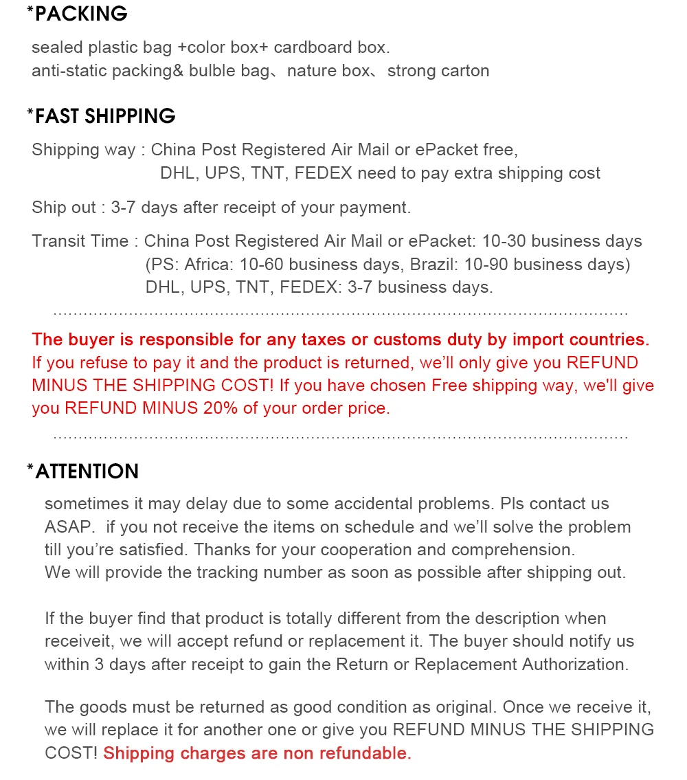3. Пожалуйста, убедитесь, что вы прочитали спецификацию продукта перед покупкой, и если у вас есть какие-либо сомнения, пожалуйста, не стесняйтесь связаться с нами viaTradeManager/бесед/сообщения о заказе