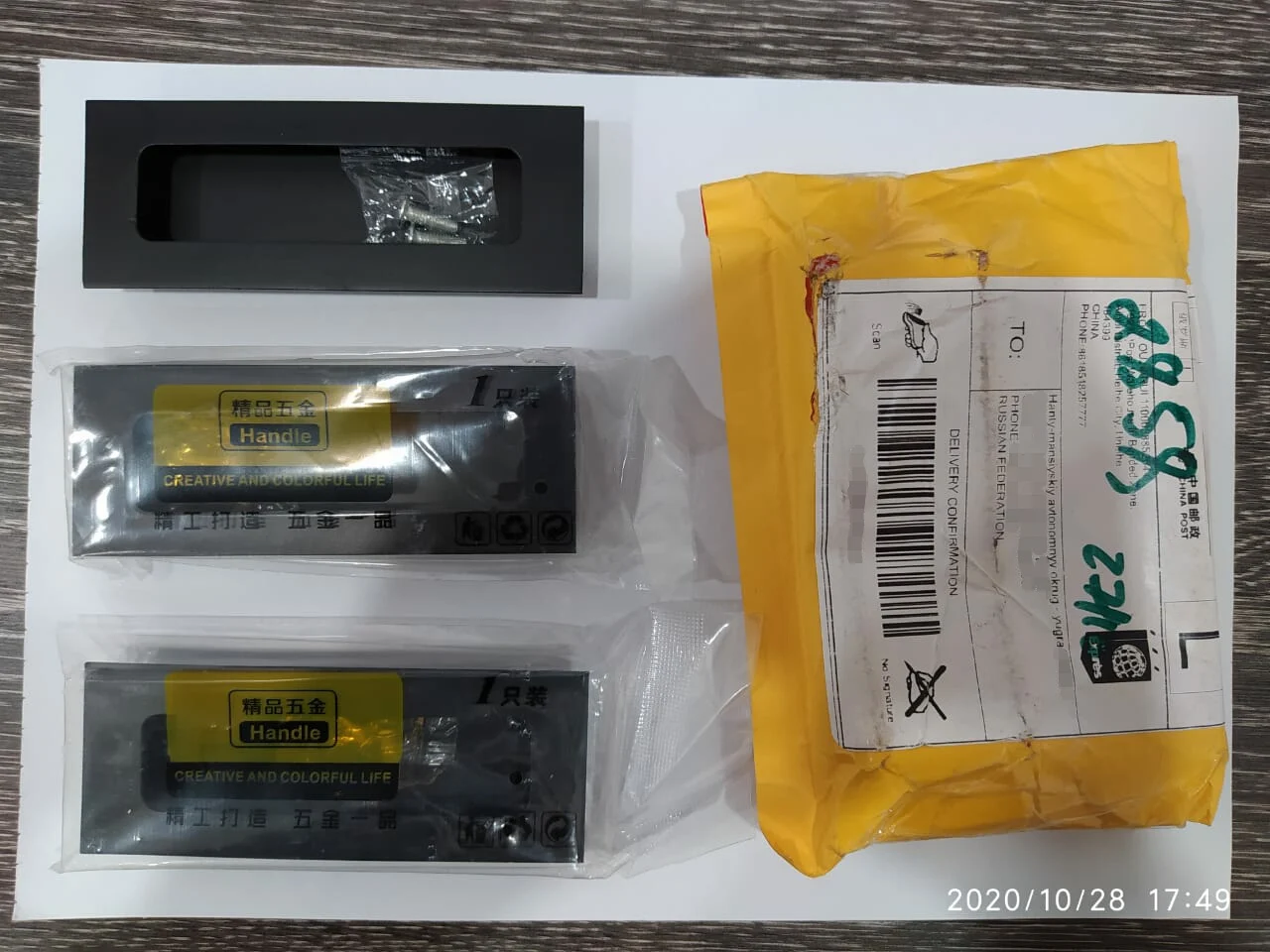 Заказ сделан 11.09.20, получен 28.10.20 (отправка долгая: почти две недели заказ пролежал в почтовом отделении Китая, - за это звезду снял). Упаковка не очень надежная (бумажный пакет с пупырчатой пленкой) - при транспортировке на одной из 3-х ручек возникли незначительные потертости, т.к. упаковка в некоторых местах перетерлась. В комплекте ручка и два коротких винтика. Заказывал для тумбочки с выдвижными ящиками, но пока не монтировал, т.к. в фасадах нужно сделать соответствующие вырезы. В целом заказом очень доволен. Получил именно тот тип ручек, который и хотел - требовались врезные ручки черного матового цвета с минимальным наружным выступом из фасада. Ручки выполнены из алюминия, покрытого черной матовой краской. Товар к покупке однозначно рекомендую. Продавцу успехов и здоровья!