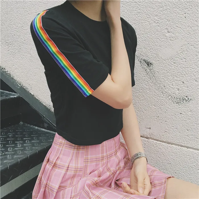 Женские футболки, летние, короткие, универсальные, с радужным принтом, с коротким рукавом, 2017