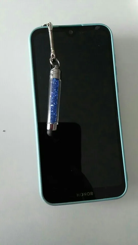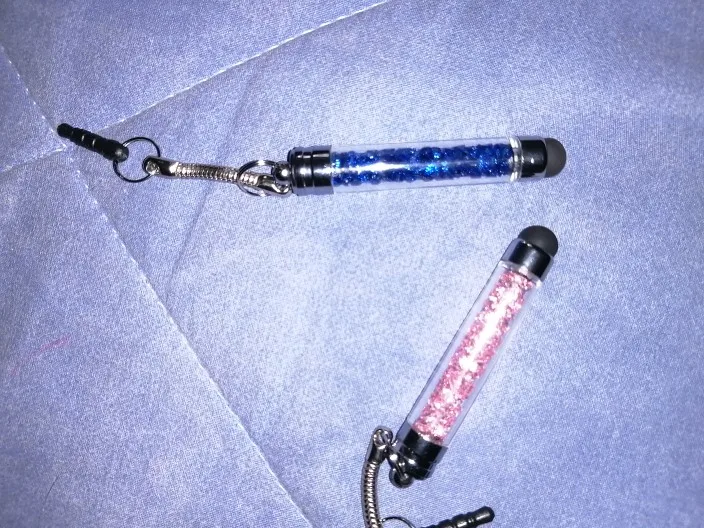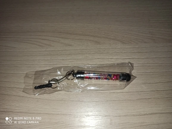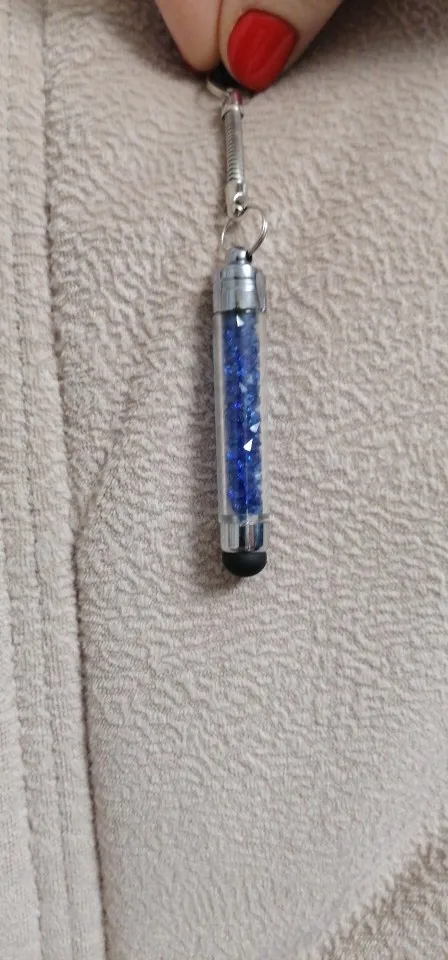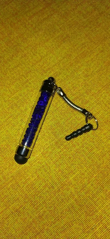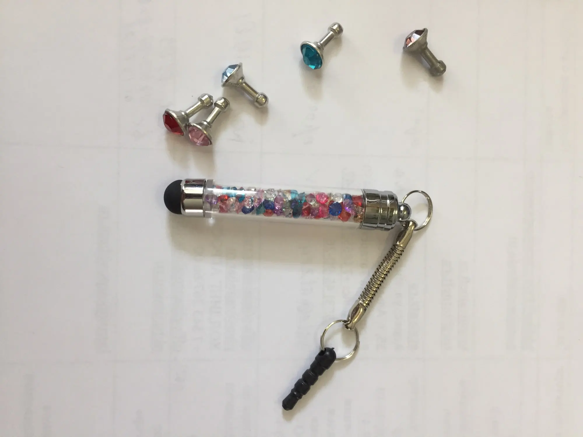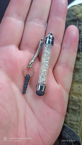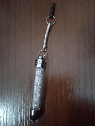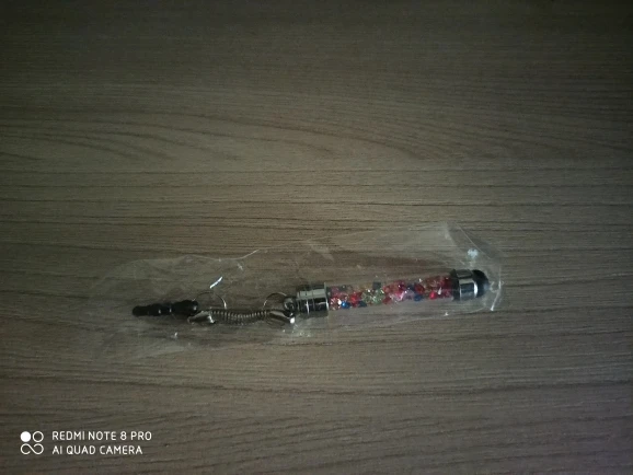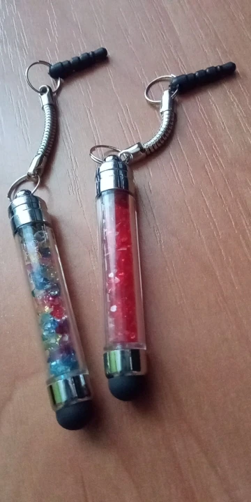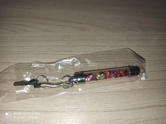 Заказ дошел быстро. Сделан аккуратно. Камешки разноцветные, симпатично переливаются. Стилус работает.
