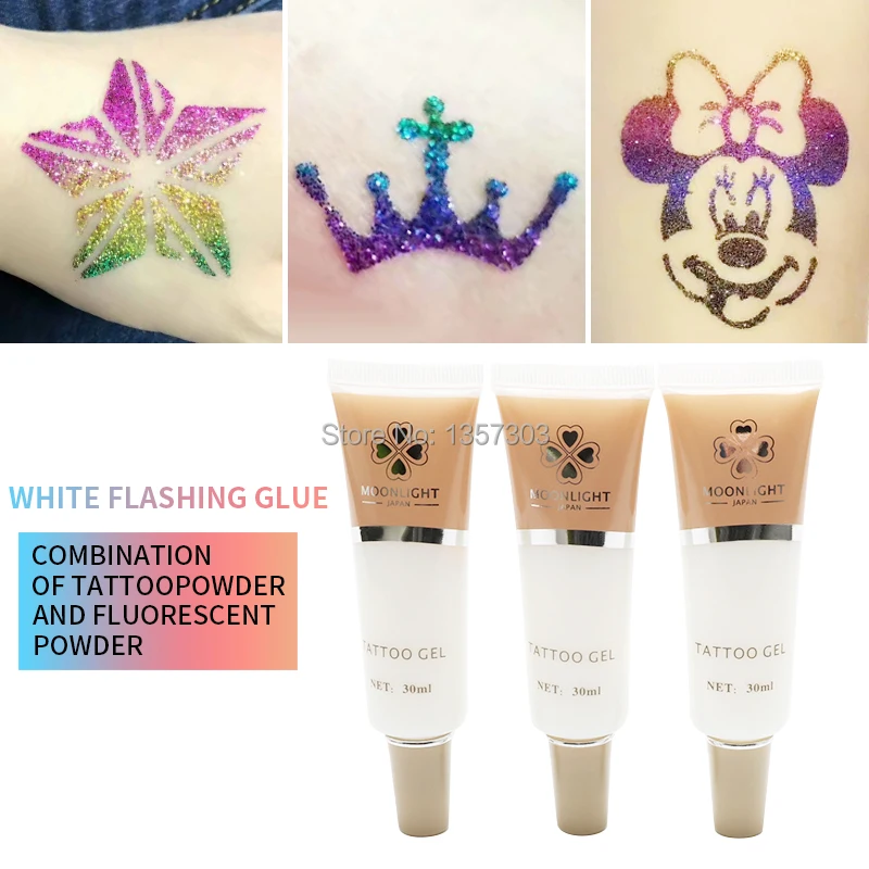 3 шт. белый цветной блестящий клей гель для тату (30 мл/бутылка) для временного набора татуировок Набор для боди-арта принадлежности для татуажаОписаниеКак использовать блестящие Временные татуировки наборы:1. Выберите дизайн, который вы хотите, и снимите белую подложку.2. Перед нанесением татуировки убедитесь, что кожа высохнет. Поместите наклейку на кожу в нужное вам направление и прочно нажмите, чтобы убедиться, что нет морщин или отбеливателей, снимите прозрачную пленку с наклейки.3. Используйте прибор для нанесения кисти в бутылке и нанесите клей на кожу, показывающую через трафарет.4. Удалите трафарет татуировки примерно через 1-2 минуты.5. Используйте небольшую косметическую кисть, чтобы нанести блеск на области с помощью клея. Убедитесь, что блеск полностью покрывает все области клеем. (Вы можете смешивать цвета)6. Используйте большую косметическую кисть, чтобы нажать на блеск, после того, как блеск был прочно установлен, Расчистите любой лишний блеск.7. Блестящие Татуировки прослужат около одной недели при нормальных условиях, а самое длинное-15 дней.Применение:Блестящие Временные татуировки могут быть лучшим способом рекламировать ваш бизнес, так как они легко обрабатываются, низкая стоимость и привлекательный. Используйте эти крутые блестящие временные наборы татуировок и предлагаем Временные татуировки бесплатно, попробуйте любой дизайн татуировок, помогите мальчикам и девочкам сиять и ловить внимание на вечеринках.