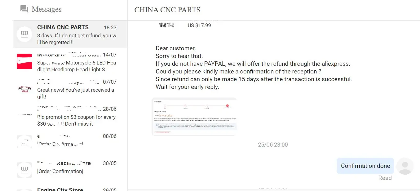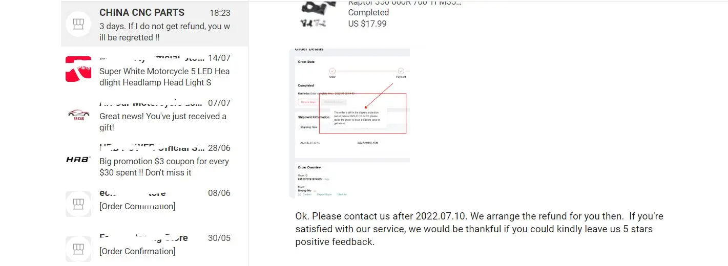 Остерегайтесь покупателя! Этот продавец отправил мне более низкий комплект для разных квадроциклов, связавшись с продавцом, они решили вернуть мне деньги, но они попросили меня подтвердить получение товаров, а затем попросили связаться с ними через 15 дней. Теперь продавец хочет вернуть деньги и не отвечает. См. Изображение! Покупатель! Это разрыв