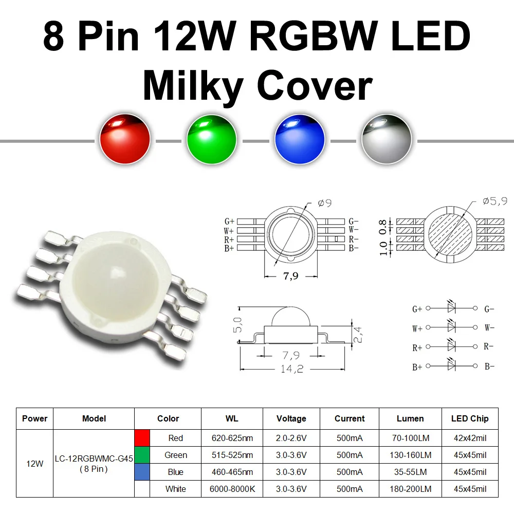 Светодиодный сценический светильник, сценическое освещение, 4 Вт, 12 Вт, RGBW, 45 мил, 1 Вт, 3 Вт, красный, зеленый, синий, белый чип, SMD диод, COB, 500 мА, 8 контактов, лампа молочного цвета