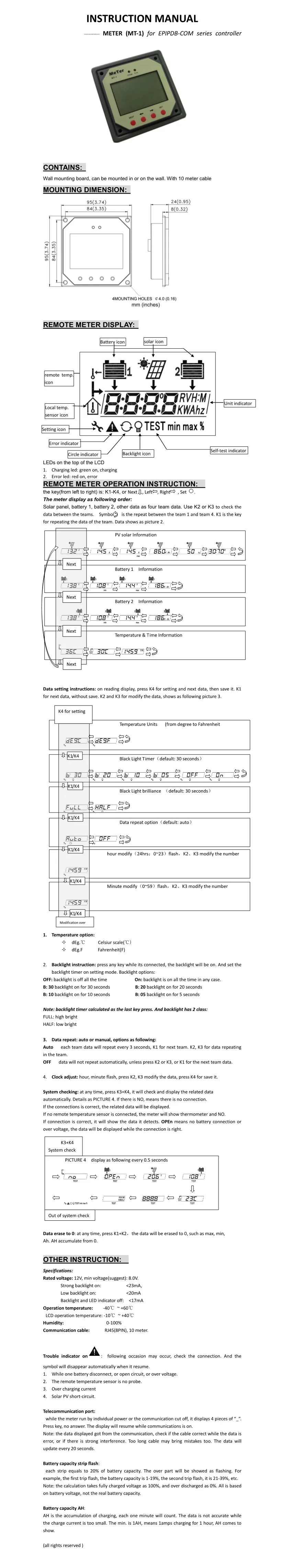 EPEVER MT-1 MT1 дистанционный Измеритель для EPSOLAR PWM контроллер...