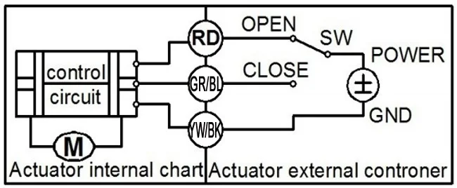 Закрытие клапана: YW/BK провода подключаются к отрицательным, между тем GR/BL провода подключаются к posotive.