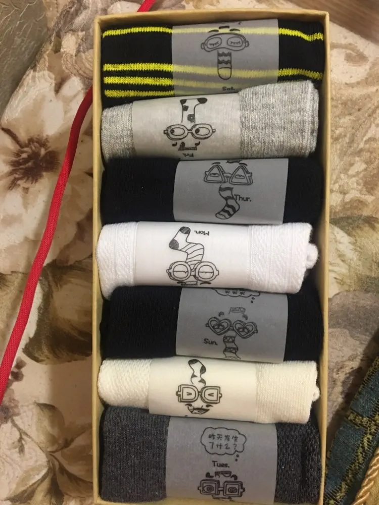 крутые носочки, но заказывал 2 коробки носков, а приехала 1 коробка и плюс 7 штук лежало без упаковки, и продавец не положил в подарок одну пару носков, жаль