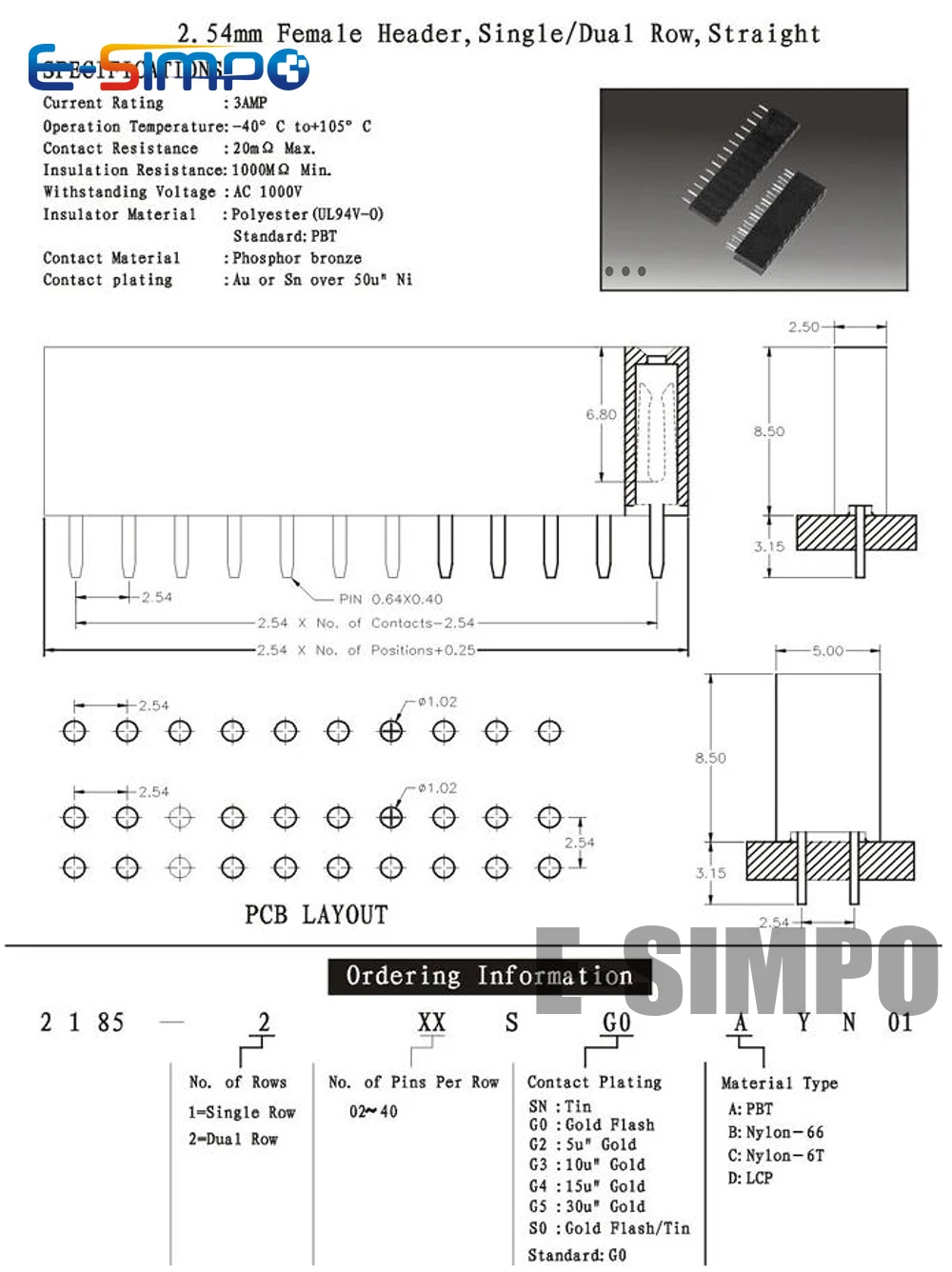 Pin-Pin расстояние/шаг: 2,54 мм Кол-во строк: Однорядный Пластик Высота 8,5 мм 1X2P---1X40P опционально