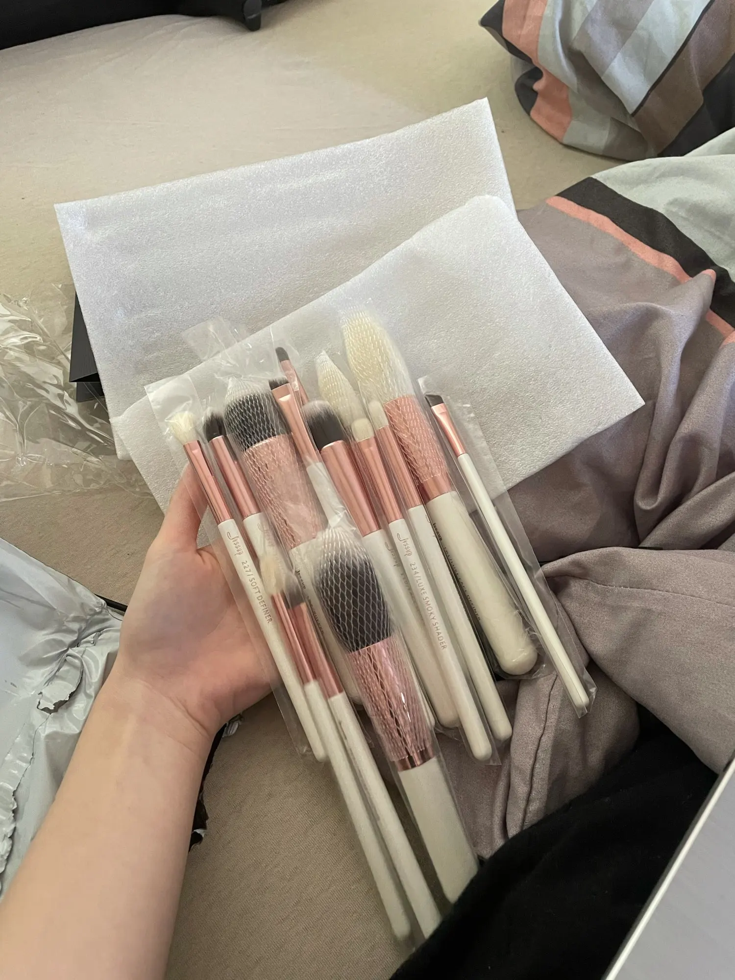Думала что будут упакованы в какую-то коробку, но нет. Зато каждая кисть лежит в целлофановых пакетиках (наверное так называется). Кисти качественные, запаха практически нет, все в целости, спасибо ! Пришло за 12 дней, доставка plus.