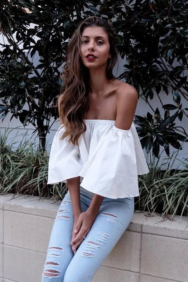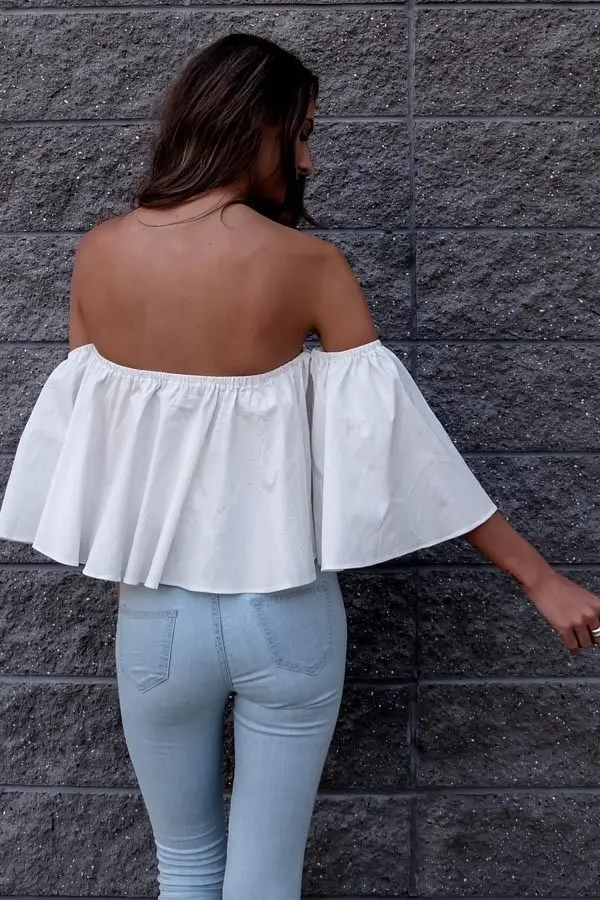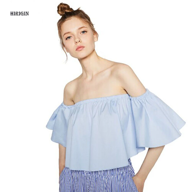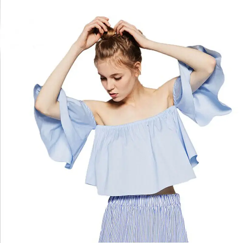 Женская шифоновая майка, с открытыми плечами и оборками, Повседневная футболка с расклешенными рукавами, топ для лета, укороченные женские топы