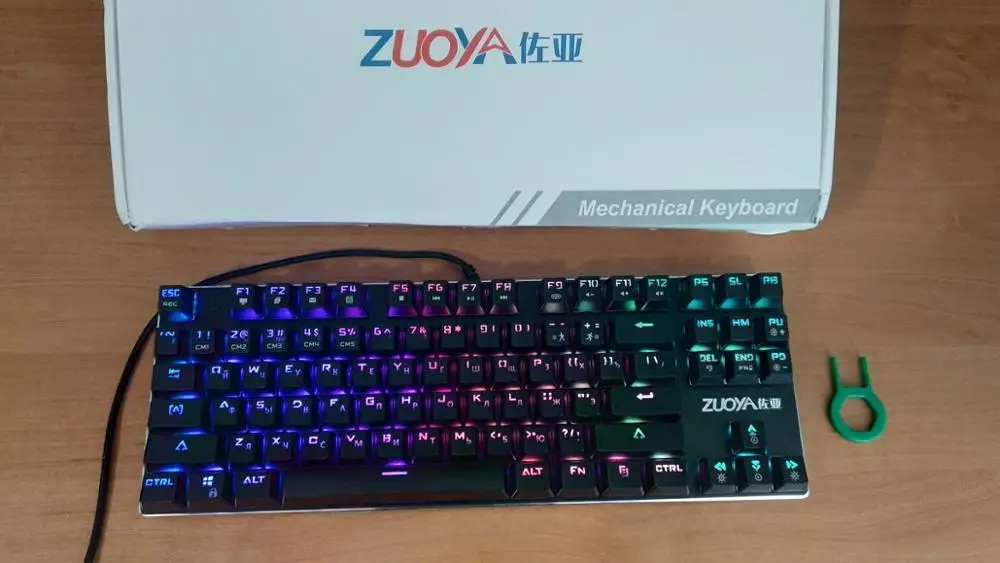 Заказ шёл довольно долго. Сама коробка очень мятая,дешевая,но внутри запакована клавиатура в пакет,а также зафиксирована поролоном. В комплекте идёт пулер для кейкапов. Клавиатура не самая удобная в использовании,тк на столе она катается так,как захочет этого сама клава. Русский шрифт напечатан не совсем хорошо,но его видно. Клаивиатура на красных кейкапах,звук нравится,осталось привыкнуть. Enter одноэтажный,шифт длинный,что очень удобно. Подсветка яркая,разнообразная - мне понравилось. Осталось лишь привыкнуть к самому главному - играм. Переход с мембранной клавиатуры на механику не удивил,но играть с такой клавой более чем комфортно.