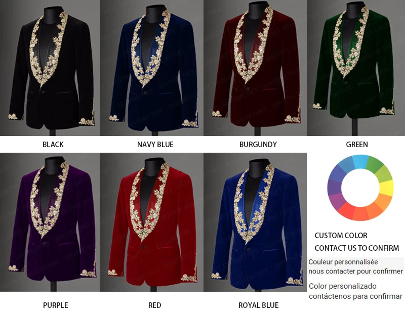 В костюм входит Бархатный жакет и пара Черного Цвета Нормальные штаны. Если вам нужны такой же цвет брюк и ткань брюк, как у вашей куртки, пожалуйста, свяжитесь с нашей службой поддержки клиентов или оставьте сообщение при размещении заказа.