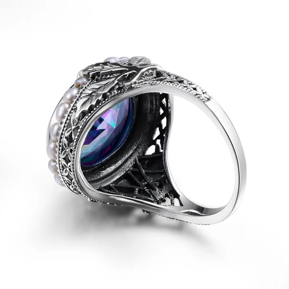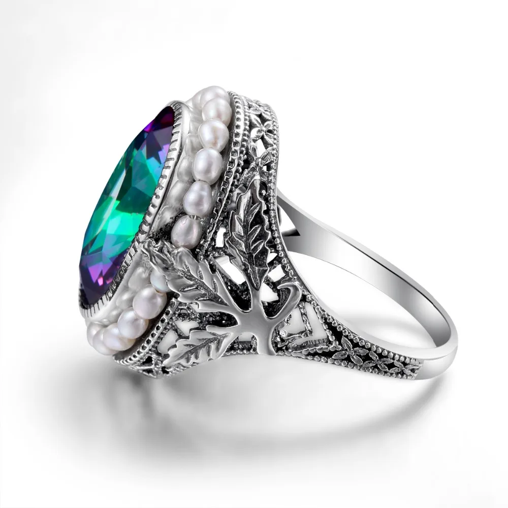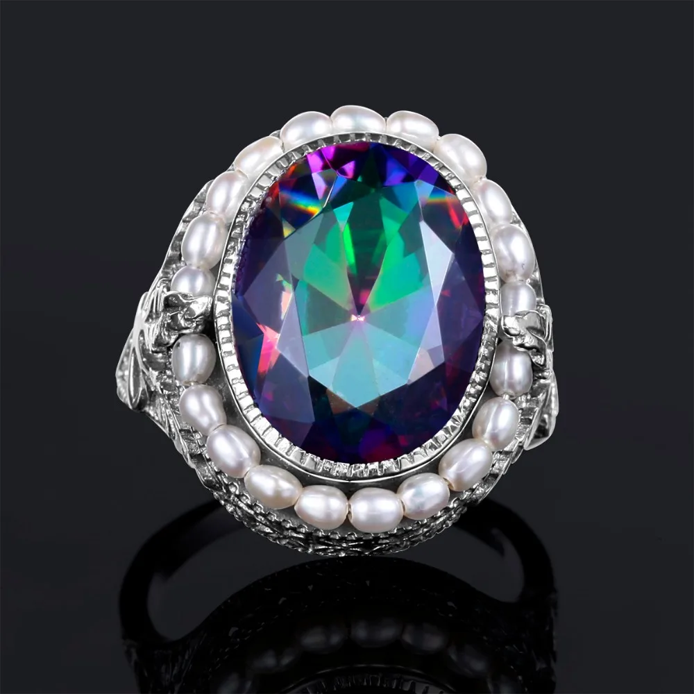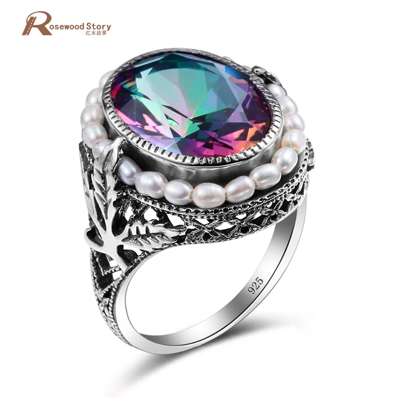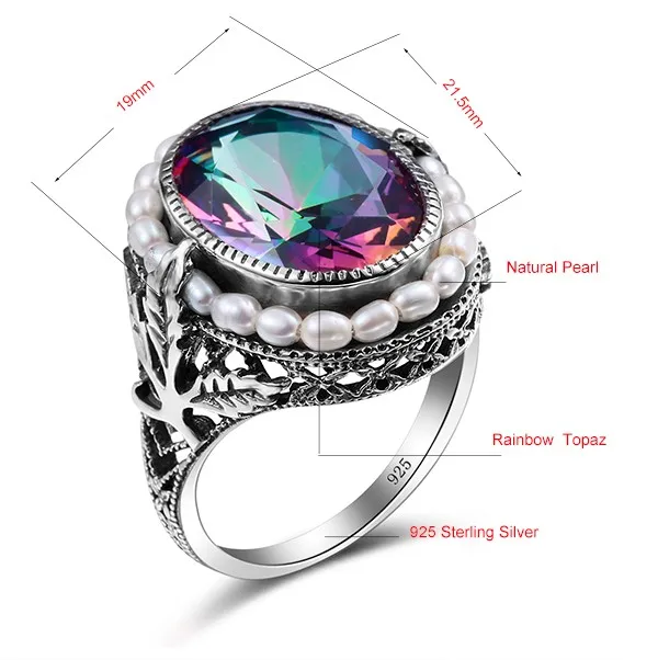 2017 Европейский стиль 925 стерлингового серебра кольца из натурального жемчуга Мистик Радуга созданный топаз Винтажное кольцо для женщин Свадебное Bijoux