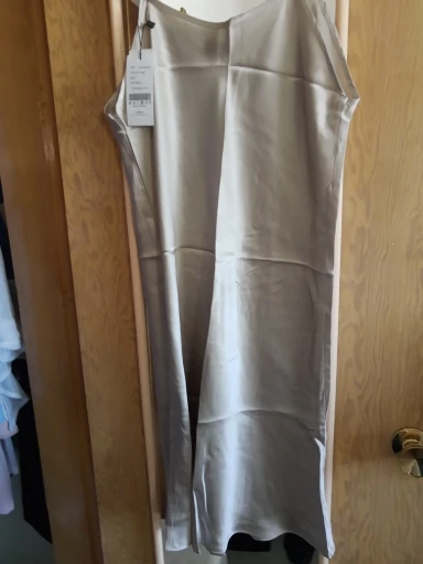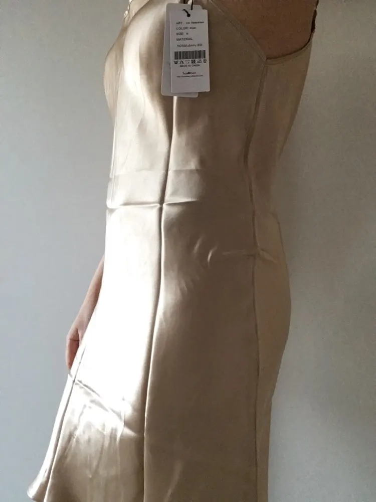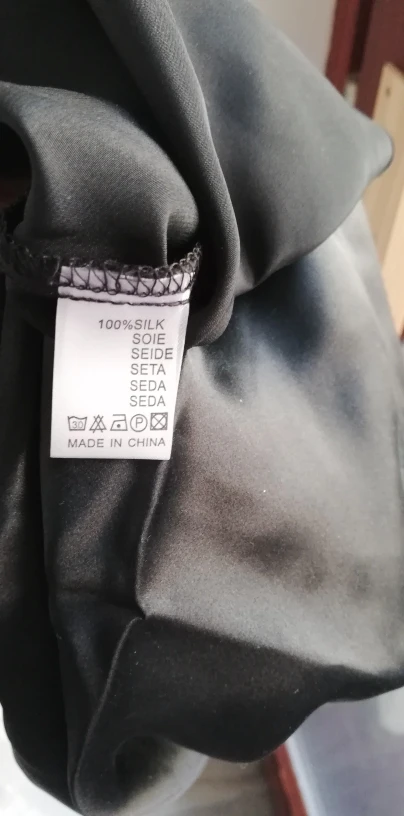 Красивое шелковое платье, размер M соответствует европейскому размеру 34-36. Черный шелк действительно приятный и не мнется после стирки, Бежевый немного тоньше и становится более морщинистым. Оба хорошо держатся в стиральной машине (шерсть/шелк Ручная стирка)