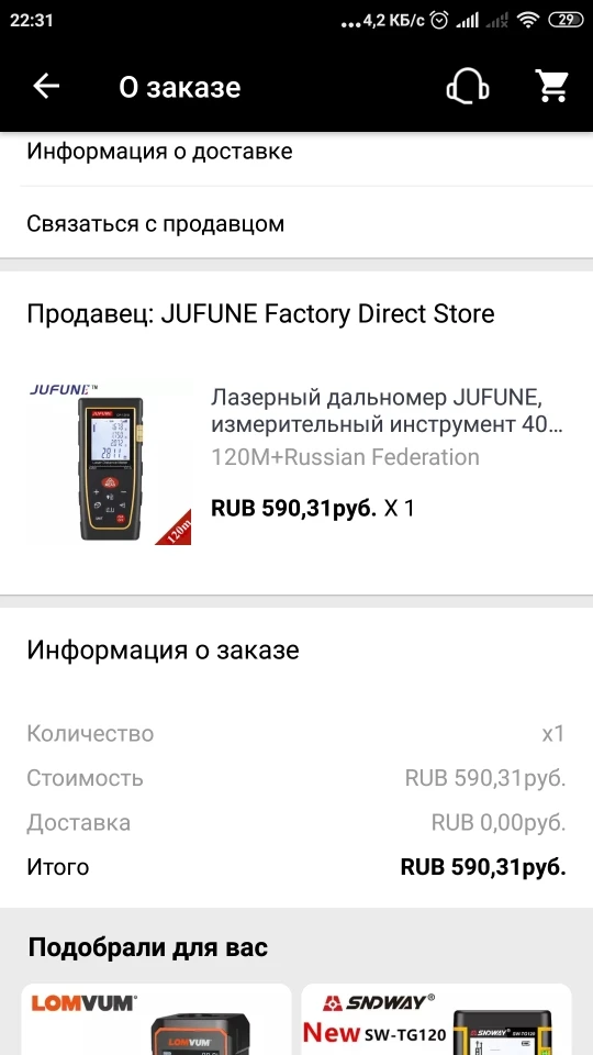 Заказал дальномер по цене 584,18 руб. которая была на ценнике. Я его за уши не тянул ставить эту цену (бухать меньше надо). Два дня ждал отправки заказа. Через два дня пришло, заказ доставлен. Не верьте тому, что написано на "заборе" и ценнике этого продавца. На связь он не выходил. Крепко подумайте прежде, чем заказать у него. p.s. Деньги вернул, но нужен был дальномер.