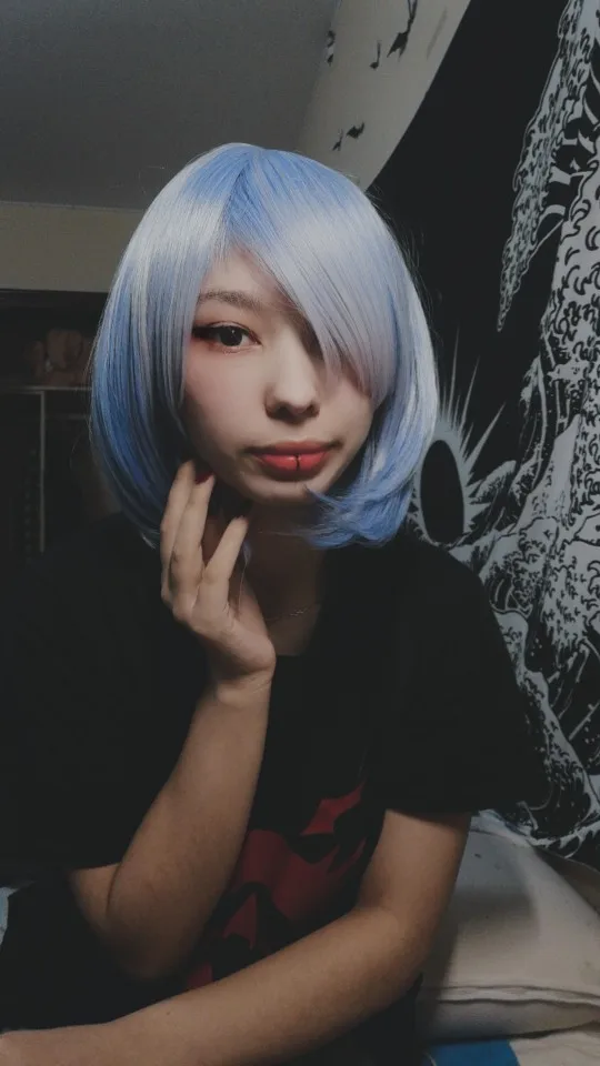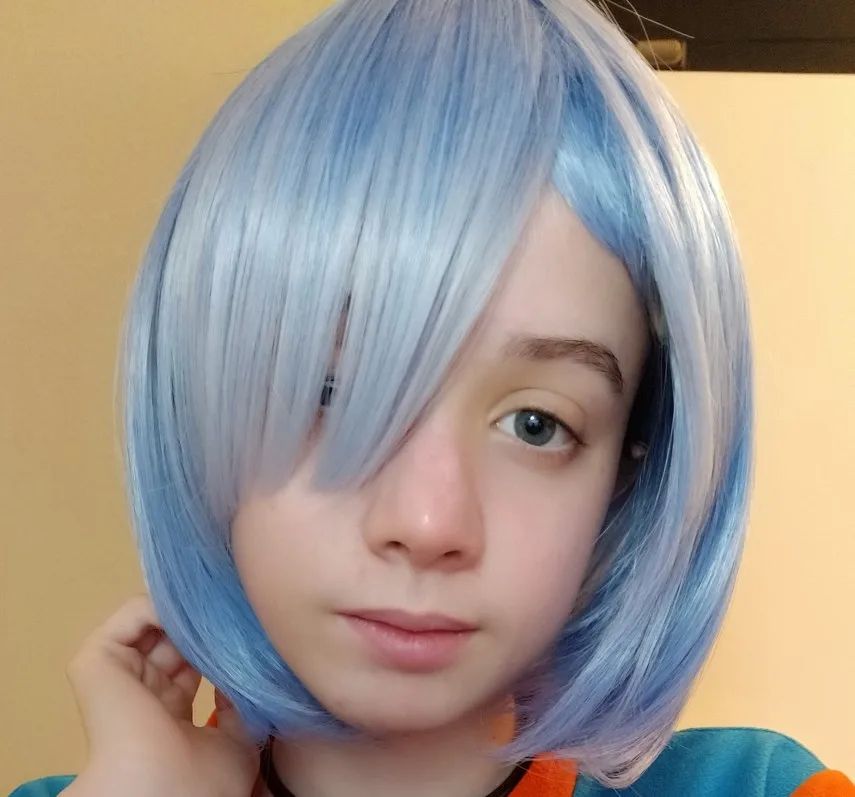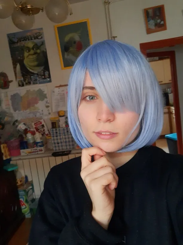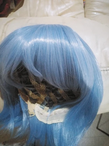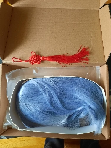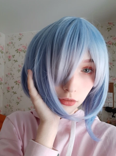 Парик отличный, имеет приятный цвет (синий и немного белый на конце волос). Было бы лучше с немного большим количеством волос на передней части, потому что когда вы стиль, как Rem's hair, сетка показывает немного... Но это хороший парик для нее! Instagram: @ aira_cosplay
