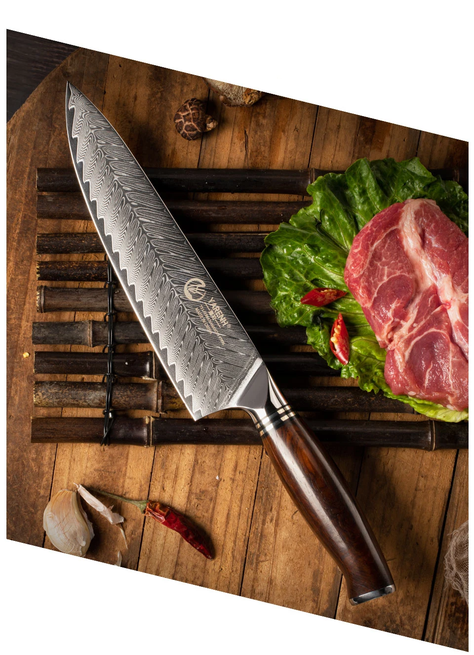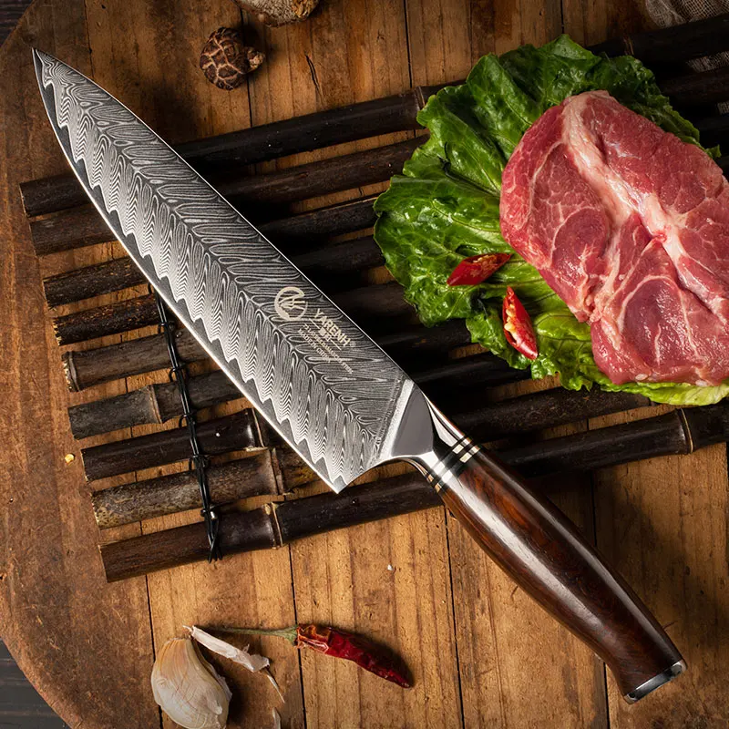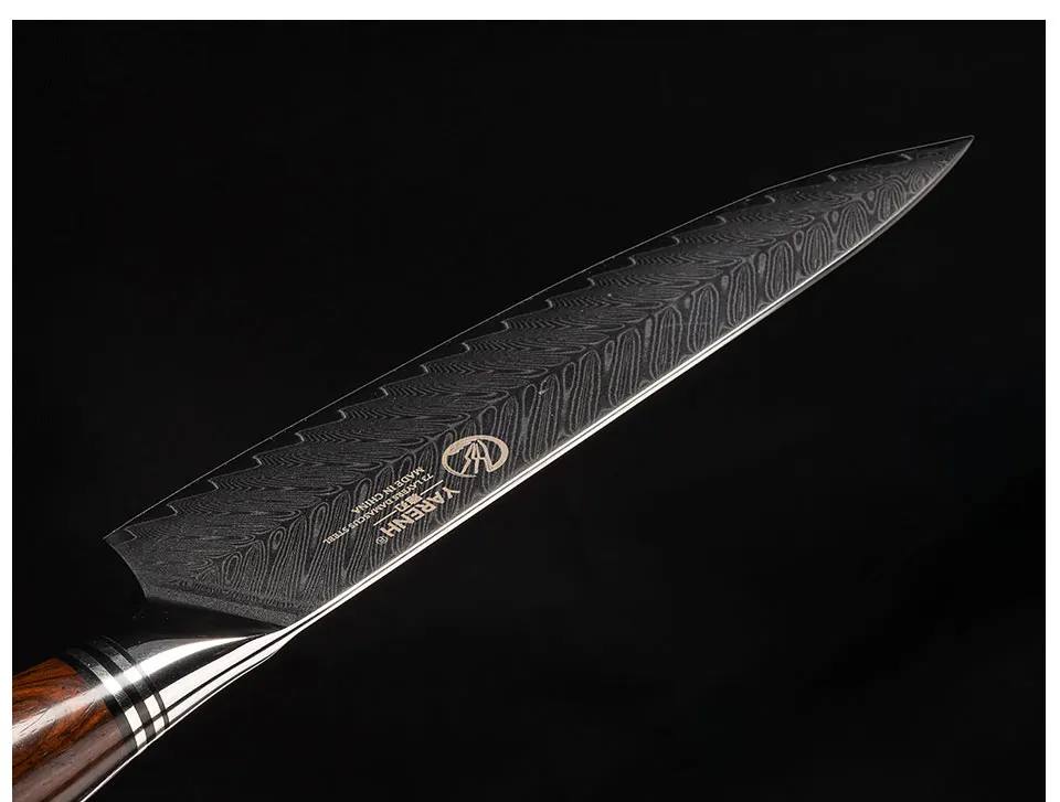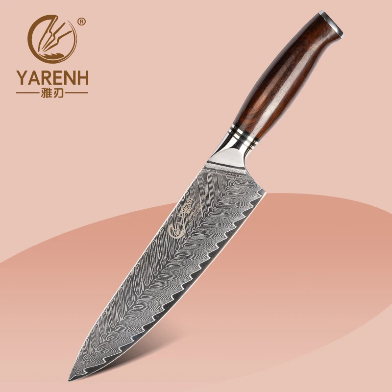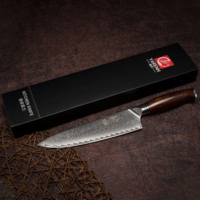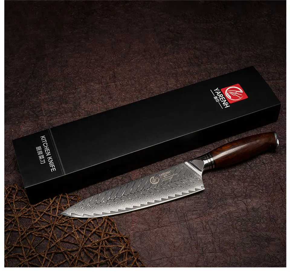 Наименование товара: кухонный нож YARENH 8 дюймов профессиональный нож шеф-повара для приготовления пищиМатериал лезвия: японский 73 слоя дамасской сталиМатериал ручки: Изысканная деревянная ручка Dalbergia, обработка оптических линзСтальной материал: 10Cr15CoMoV Высокоуглеродистая стальТвердость лезвия: 60 ± 2 HRCРезкость уровень: уровень режущей силы: 6,0-8,0 Н, международные стандарты.Упаковка: Подарочная коробка