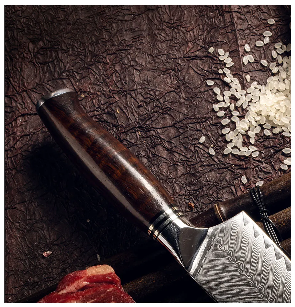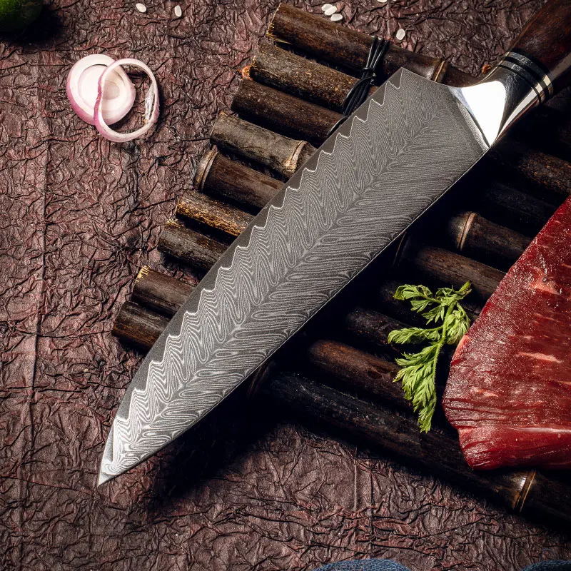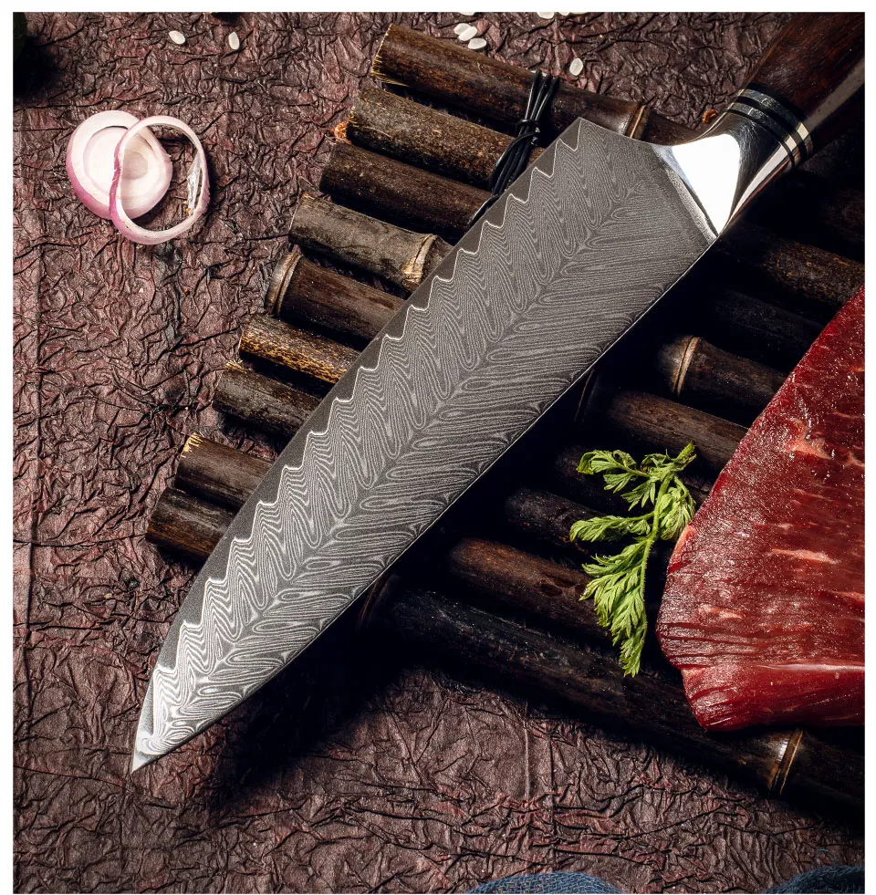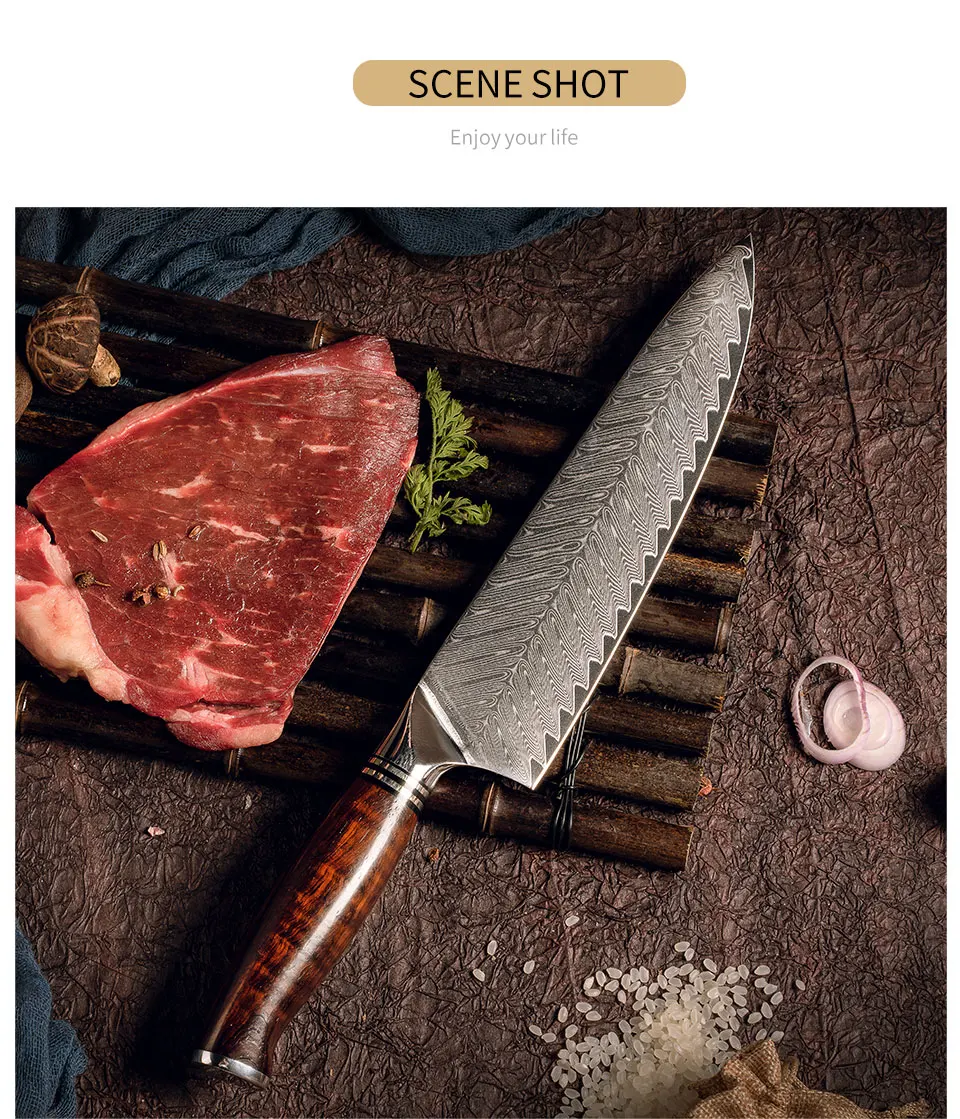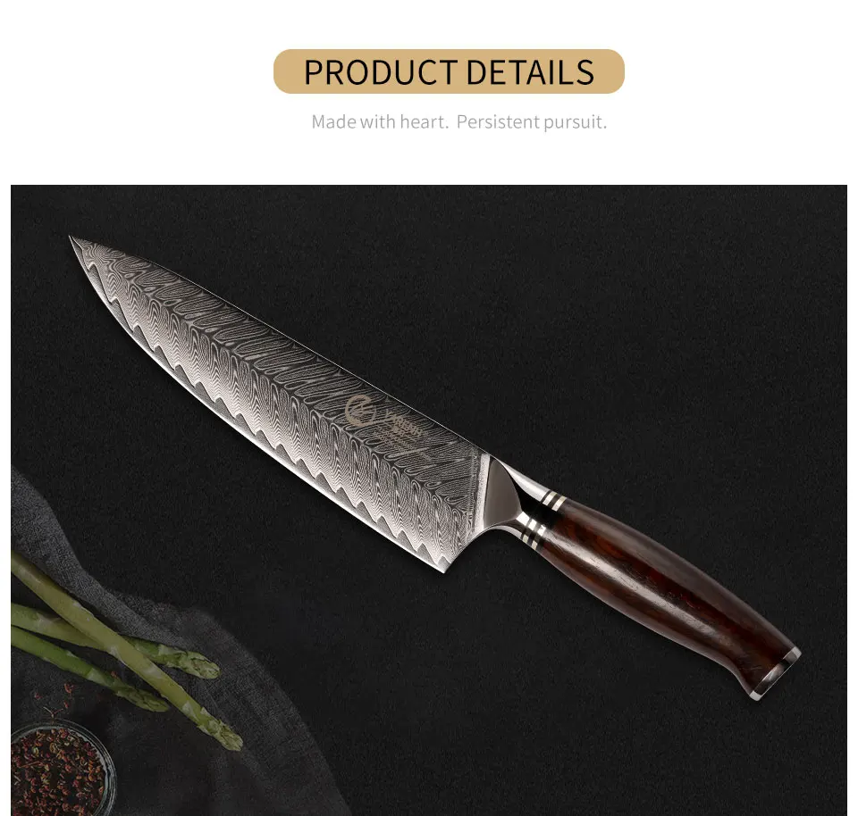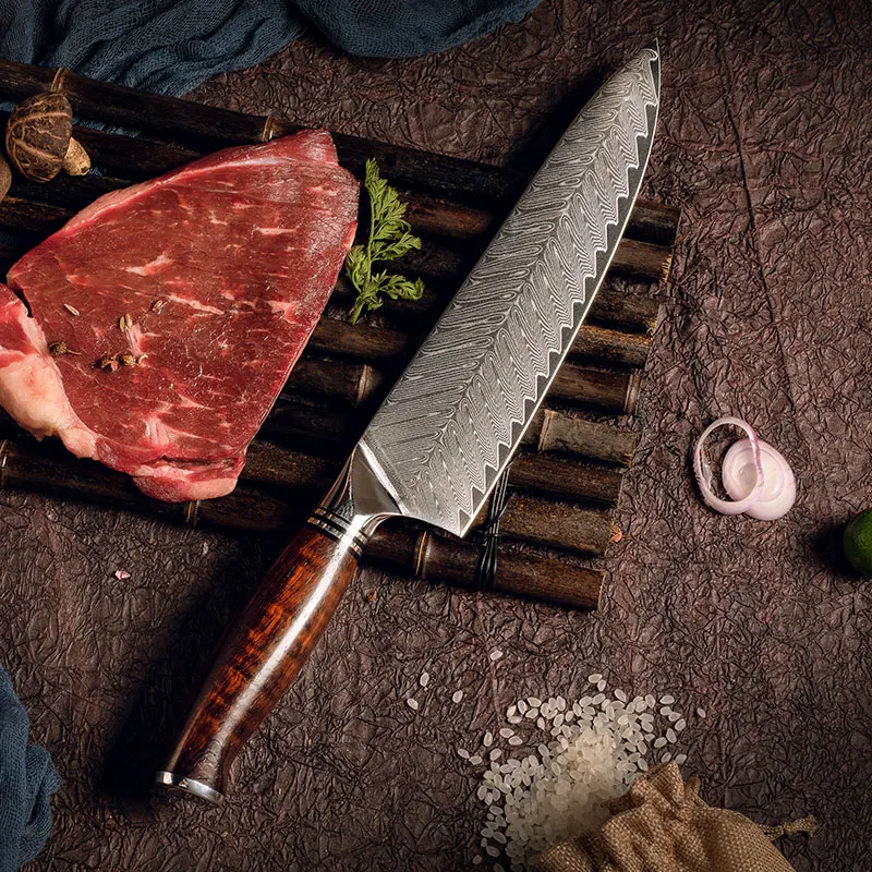 Наименование товара: кухонный нож YARENH 8 дюймов профессиональный нож шеф-повара для приготовления пищиМатериал лезвия: японский 73 слоя дамасской сталиМатериал ручки: Изысканная деревянная ручка Dalbergia, обработка оптических линзСтальной материал: 10Cr15CoMoV Высокоуглеродистая стальТвердость лезвия: 60 ± 2 HRCРезкость уровень: уровень режущей силы: 6,0-8,0 Н, международные стандарты.Упаковка: Подарочная коробка