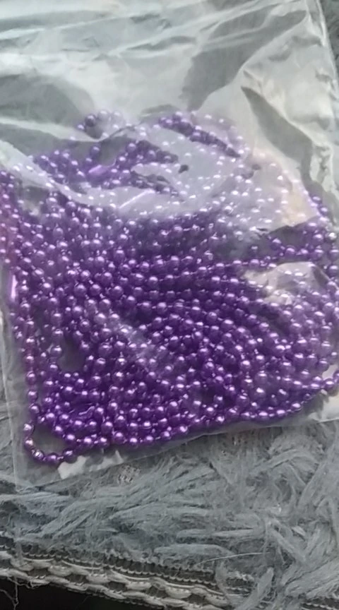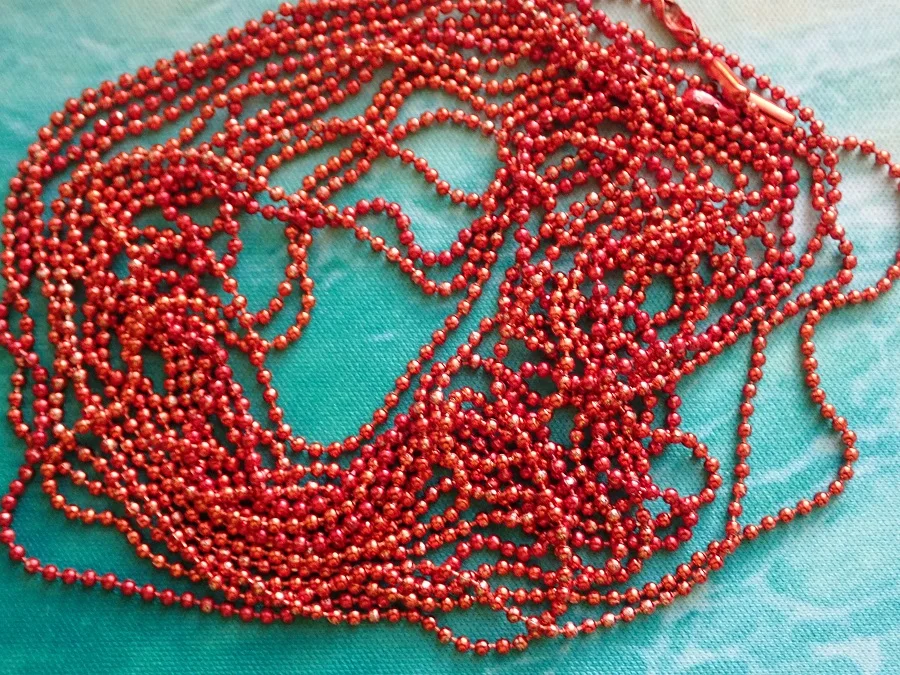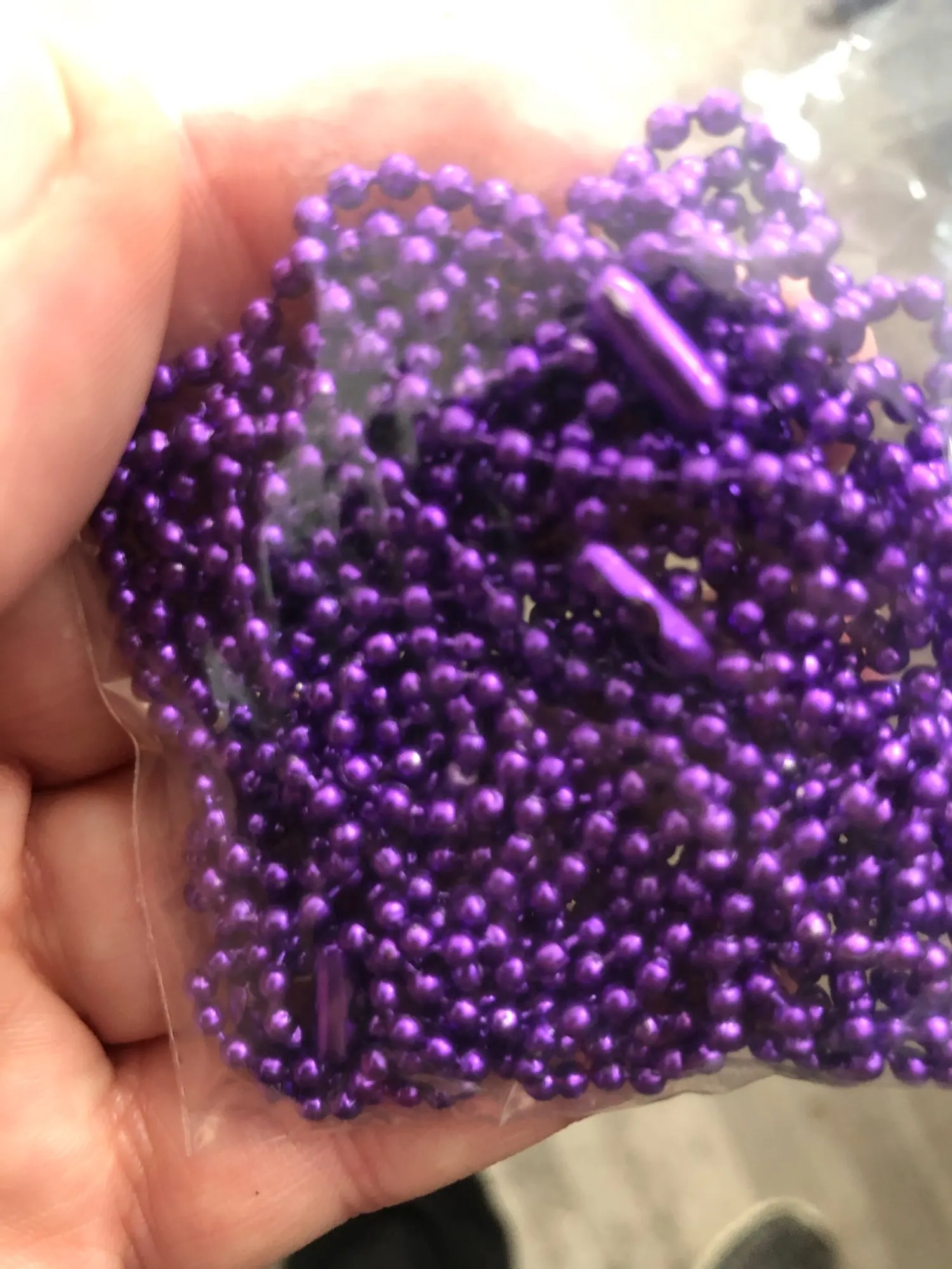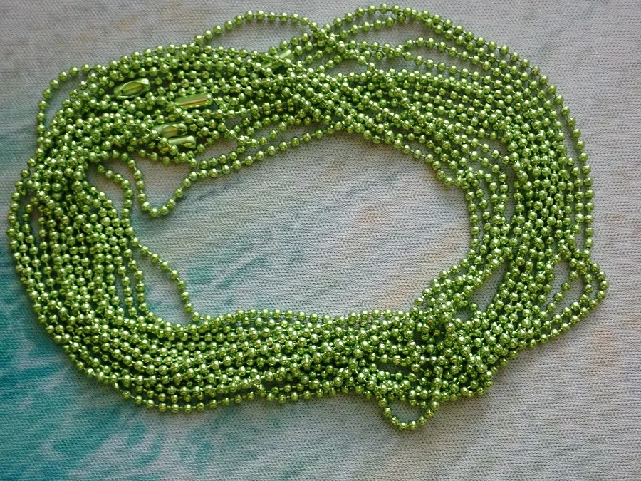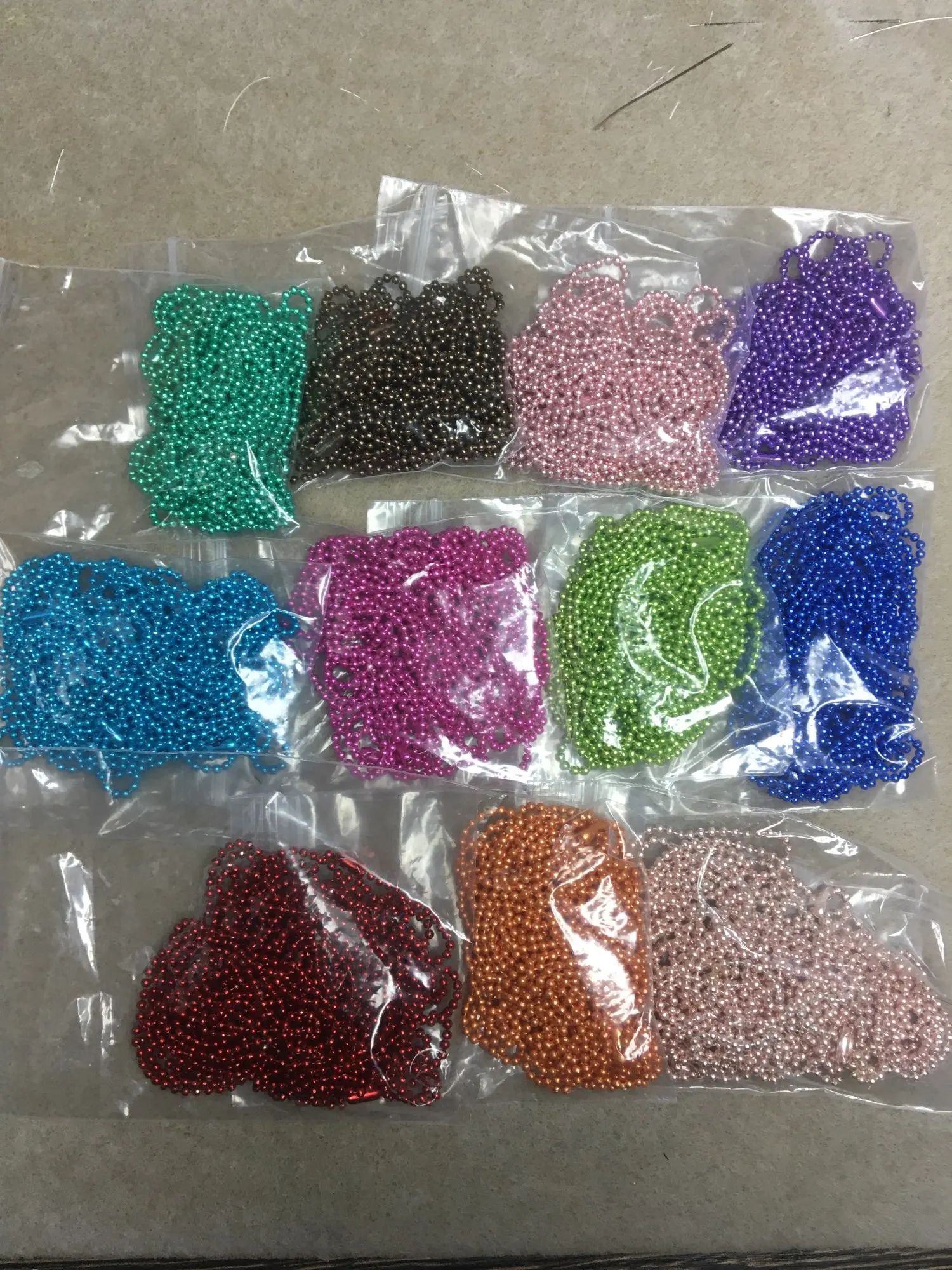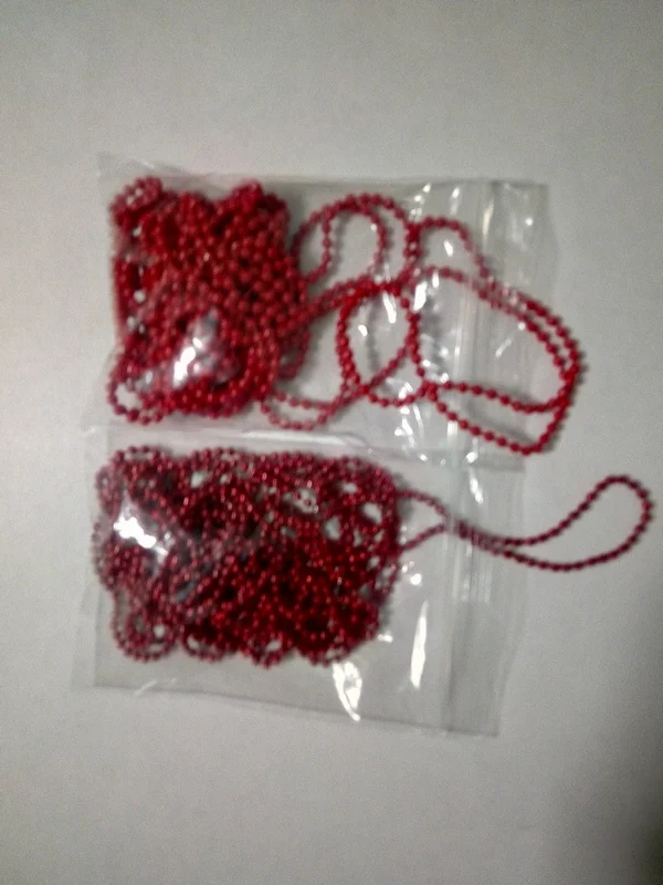 В Свердловскую область пакет дошёл за три недели. AliExpress упаковал два заказа в один пакет, который я получила на почте. Прислали пять цепочек длиной 70 см. Цепочка очень красивая, цвет яркий, сочный. Размер шариков чуть меньше стандартного (на фото для сравнения представлены все размеры, спичка - для масштаба). Качество хорошее, цвет - напыление. Не знаю, облезет или нет - время покажет. Возможно, закажу ещё цепочки другого цвета.