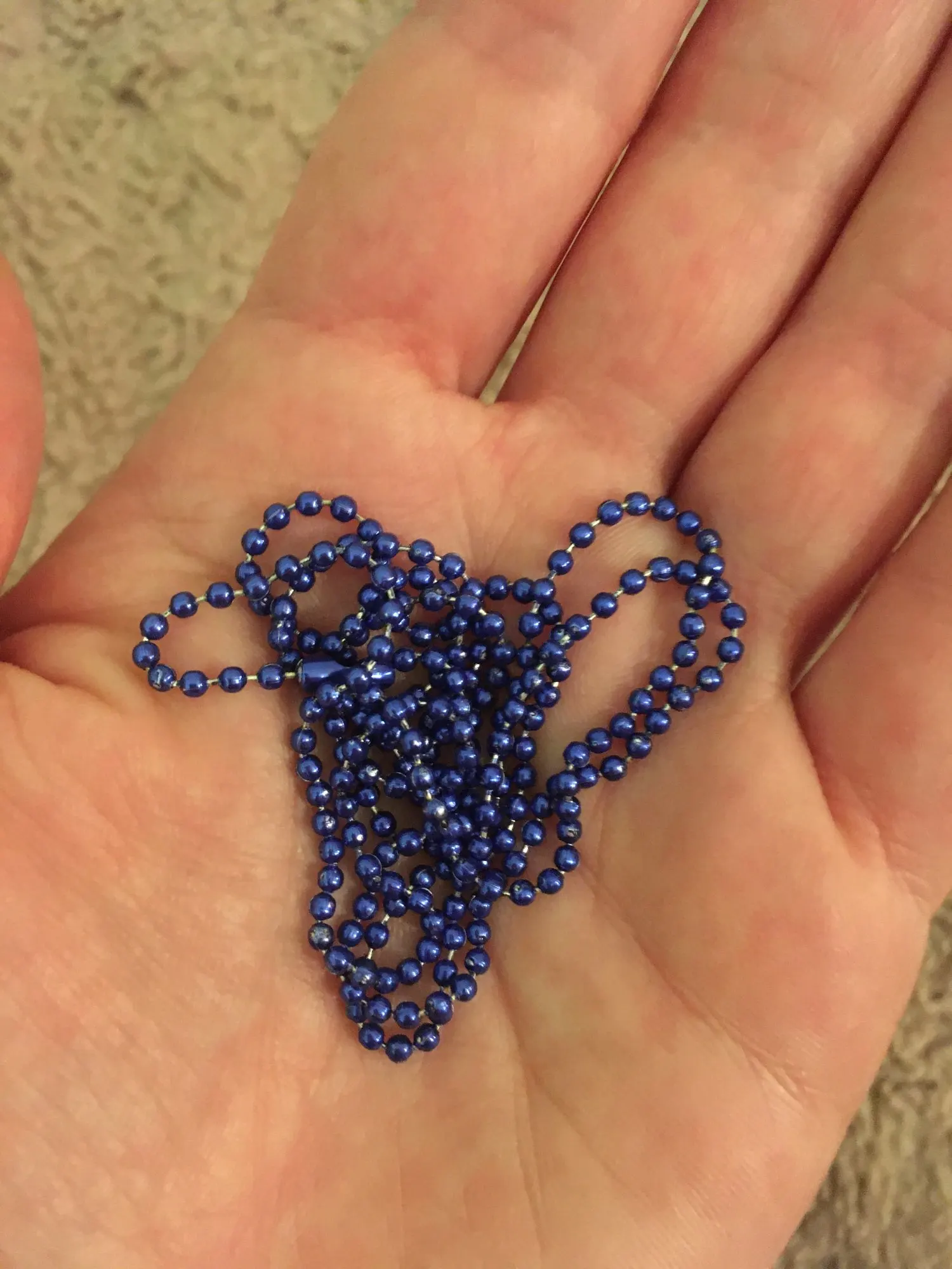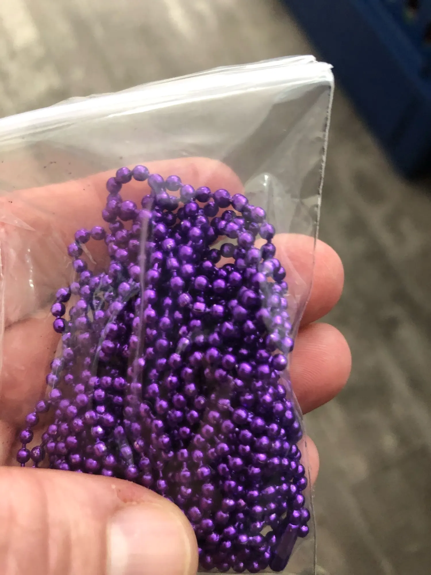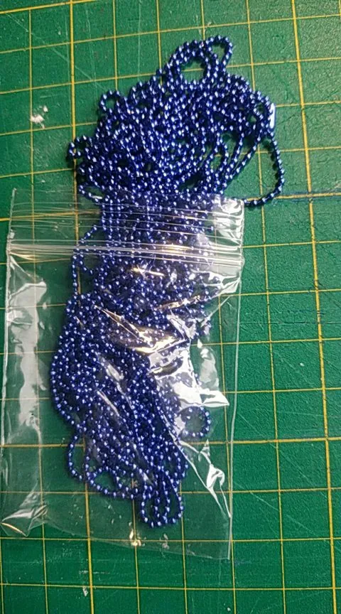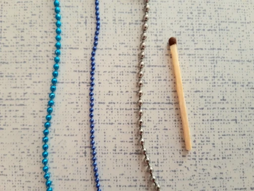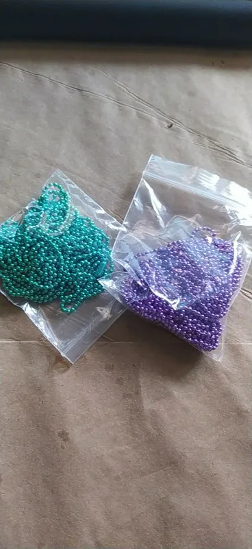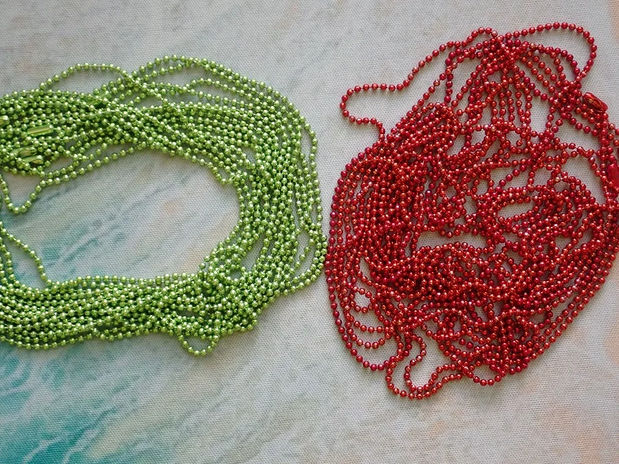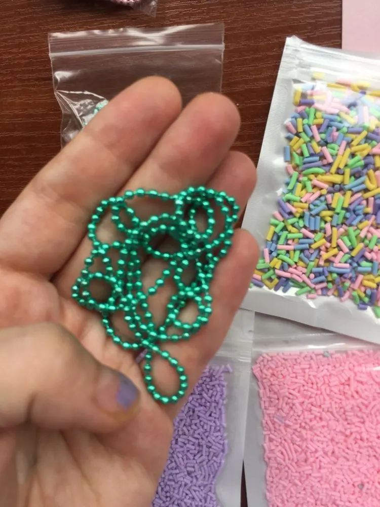 В Свердловскую область пакет дошёл за три недели. AliExpress упаковал два заказа в один пакет, который я получила на почте. Прислали пять цепочек длиной 70 см. Цепочка очень красивая, цвет яркий, сочный. Размер шариков чуть меньше стандартного (на фото для сравнения представлены все размеры, спичка - для масштаба). Качество хорошее, цвет - напыление. Не знаю, облезет или нет - время покажет. Возможно, закажу ещё цепочки другого цвета.