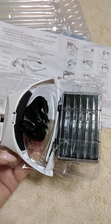 Хорошие очки. Батарейки (3шт.) нужны, с очками не идут. Освещение яркое, линзы - первые 2 шт. мне подошли, остальные слишком для меня сильные. Ремешок не пригодился, с моей головы очки не падают. Делала маникюр - очки очень помогли. Я довольна. Продавец отправил очки сразу, до Перми дошли за 3 недели (отслеживалось). Упаковано отлично. Рекомендую.