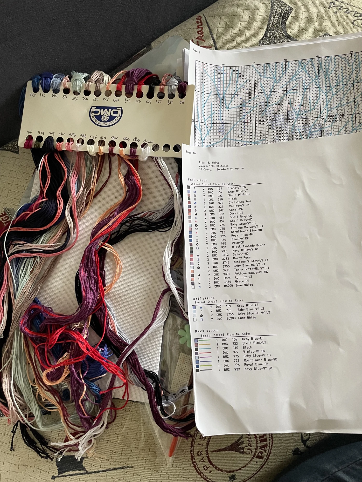 100% хлопковая нить, холст Aida, иглы, бумажная Таблица (Инструкция на английском языке, цветная печать, размер А4/страница)
