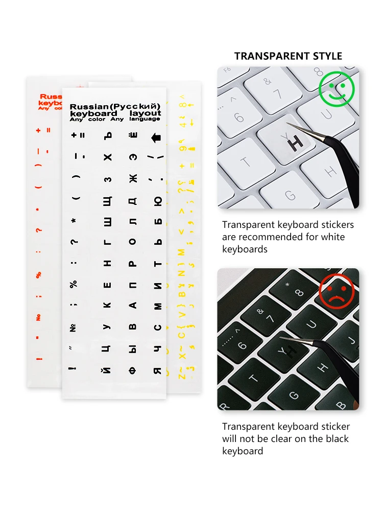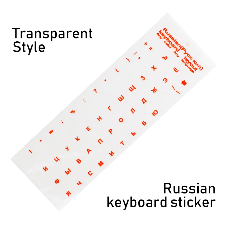 Данный вид наклеек ПРОЗРАЧНЫЙ с крупными русскими и мелкими англ. буквами, не такого производителя, как другие наклейки у этого продавца. Когда заказывал - думал, что они не прозрачные. Понравились крупные русские - пришлось вырезать только русские и при поклейке точно приставлять к родным буквам, чуть меньшего шрифта. В общем неплохо, но хотелось бы больше выбора на белом фоне - два цвета, крупные и англ. и русские и чтобы пластик не просвечивался. Время покажет насколько они долго прослужат.