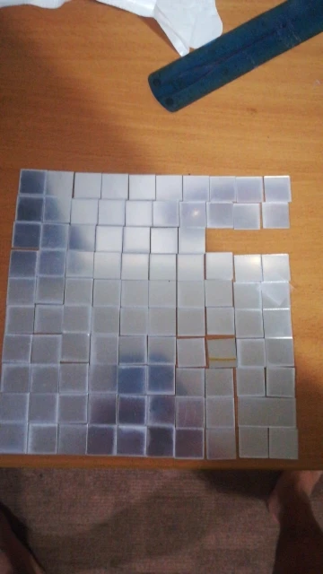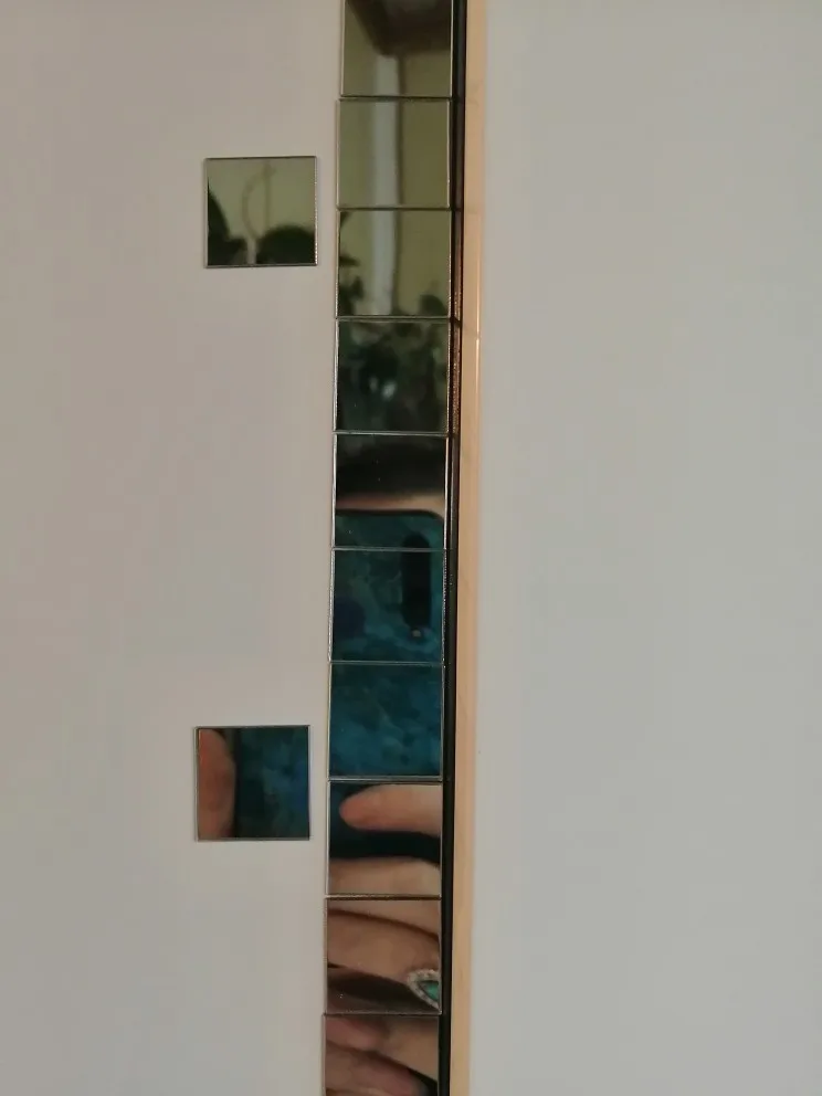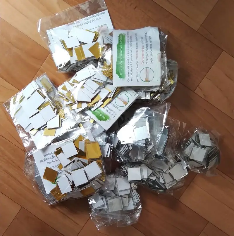 Заказывала золотой, пришёл серебряный набор. Но, может это и к лучшему. Кубики аккуратно нарезанны без брака, под защитой мутной плёнкой идеальное зеркало. Это тонкий пластик, липнет хорошо. При попытке отклеить, чуть ногтя не лишилась. На дверь у меня ушло 3 пачки, центральный рисунок ещё не дошёл. В живую смотрится очень эффектно, всё переливается и красиво отражает свет. Доставка быстрая.