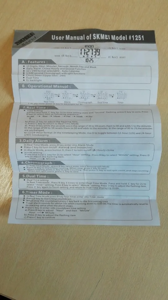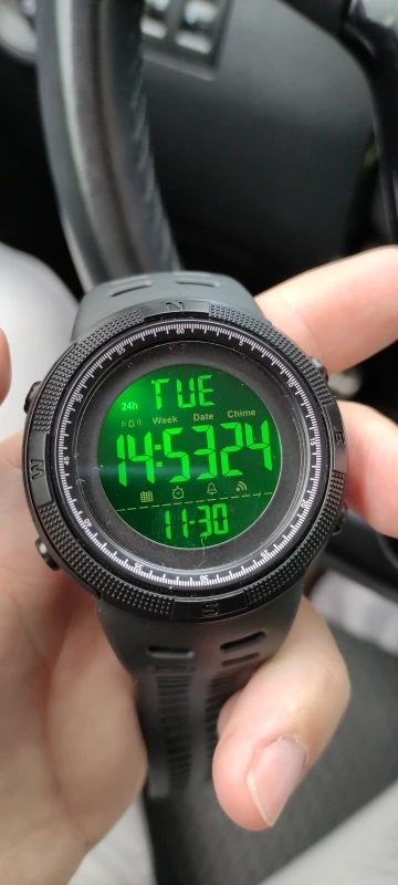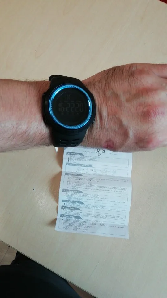 Вполне сносные часики, за 650 р вполне себе ок, если кому лень переводить мануал ю, который идёт с часами, то чтобы настроить время - зажимает правую нижнюю клавишу, переключение по блокам левая нижняя, увеличение цифр правая верхняя, ну а левая верхняя просто подсветка. Дошло быстро, правда не курьером, а сам на почте забирал по извещению, а так всё ок, рекомендую.