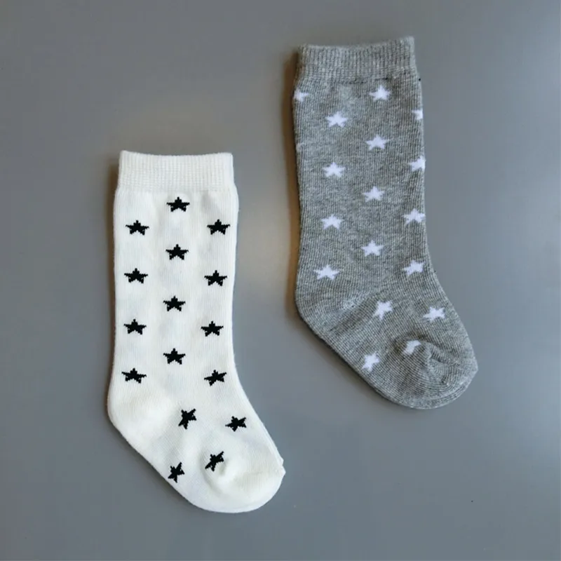 Милые детские носки, Хлопковые гольфы для девочек, длинные гольфы со звездами для маленьких девочек и мальчиков, детские гольфы до колена, белая детская обувь, чулочно-серые