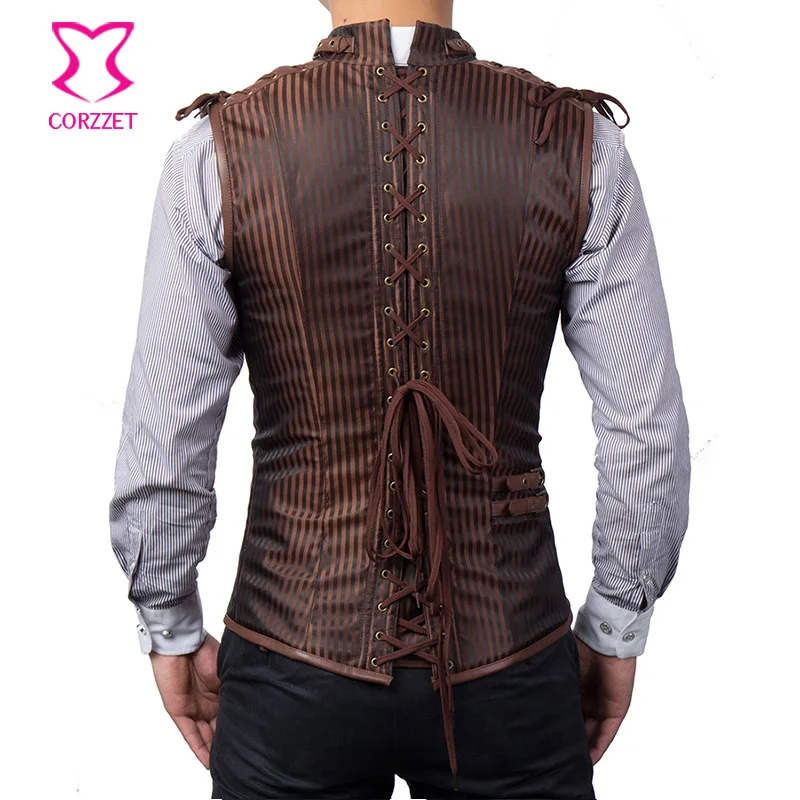 Винтажный коричневый полосатый атласный мужской корсет в стиле стим...