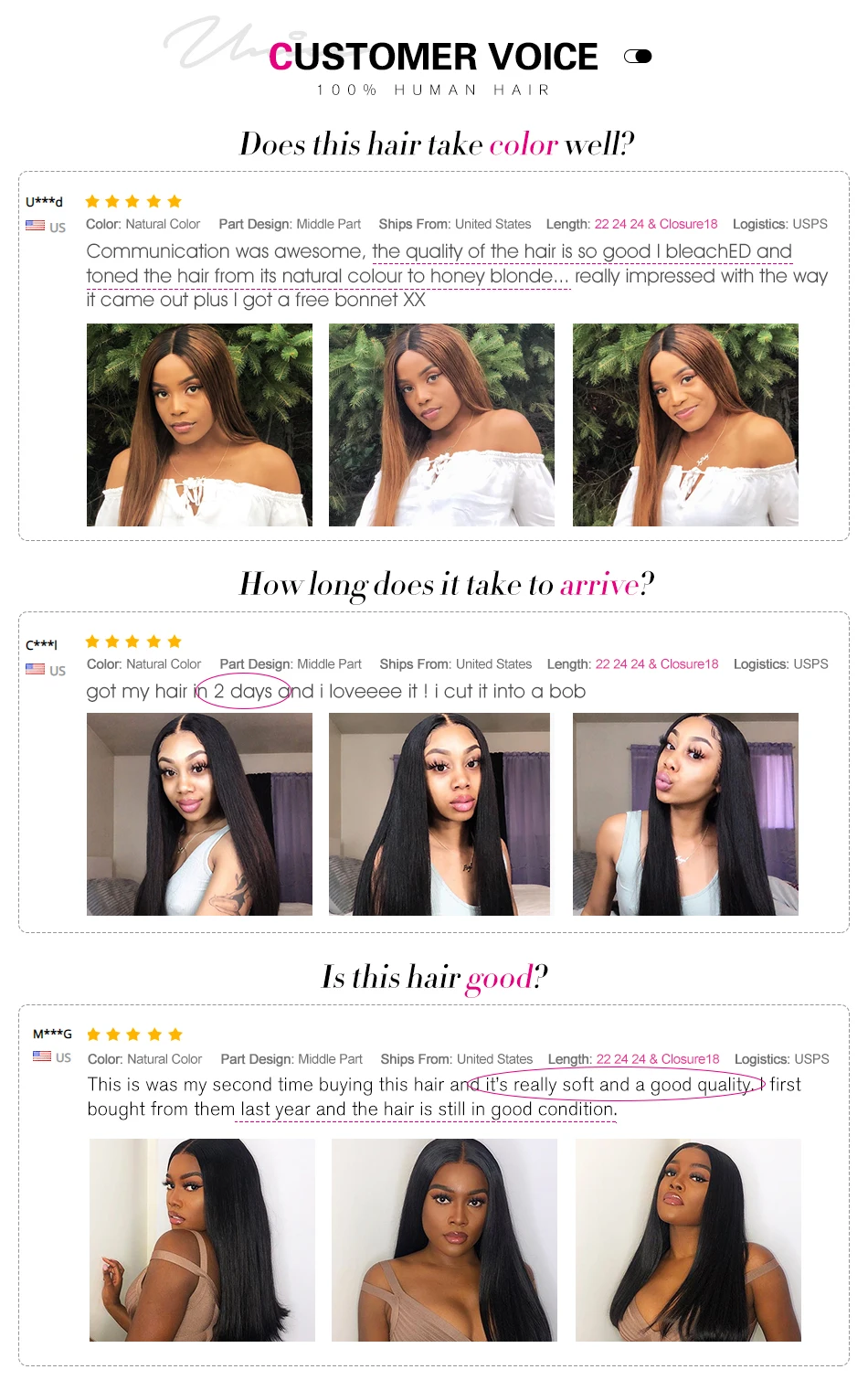 Я люблю волосы Unice! Это примерно мой 5-й раз заказа, и они никогда, кажется, не подведут меня. Волосы мягкие и соответствуют длине. Они также добавляют дополнительные лакомства, чтобы удовлетворить ваши потребности в красоты. Я очень скоро буду заказывать снова.