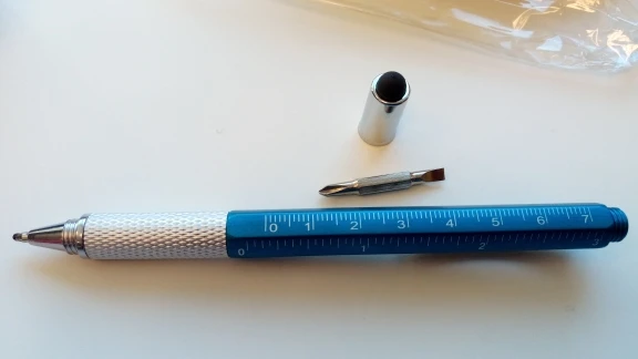Доставка - 2 месяца. Ручка пишет отлично, но стержень коротенький. Корпус - довольно крепкий пластик. Стержень выдвигается выкручиванием ручки. По функционалу - всё как и заявлено: ручка, плоская и фигурная отвёртки, стилус, уровень и линейки. Из минусов - небольшой дефект покраски корпуса (пятнышко) и ещё то, что не совпадают нулевые отметки у линеек в дюймах и сантиметрах. Но не смотря на это ручка хорошая, понравилась, спасибо) Продавца рекомендую.