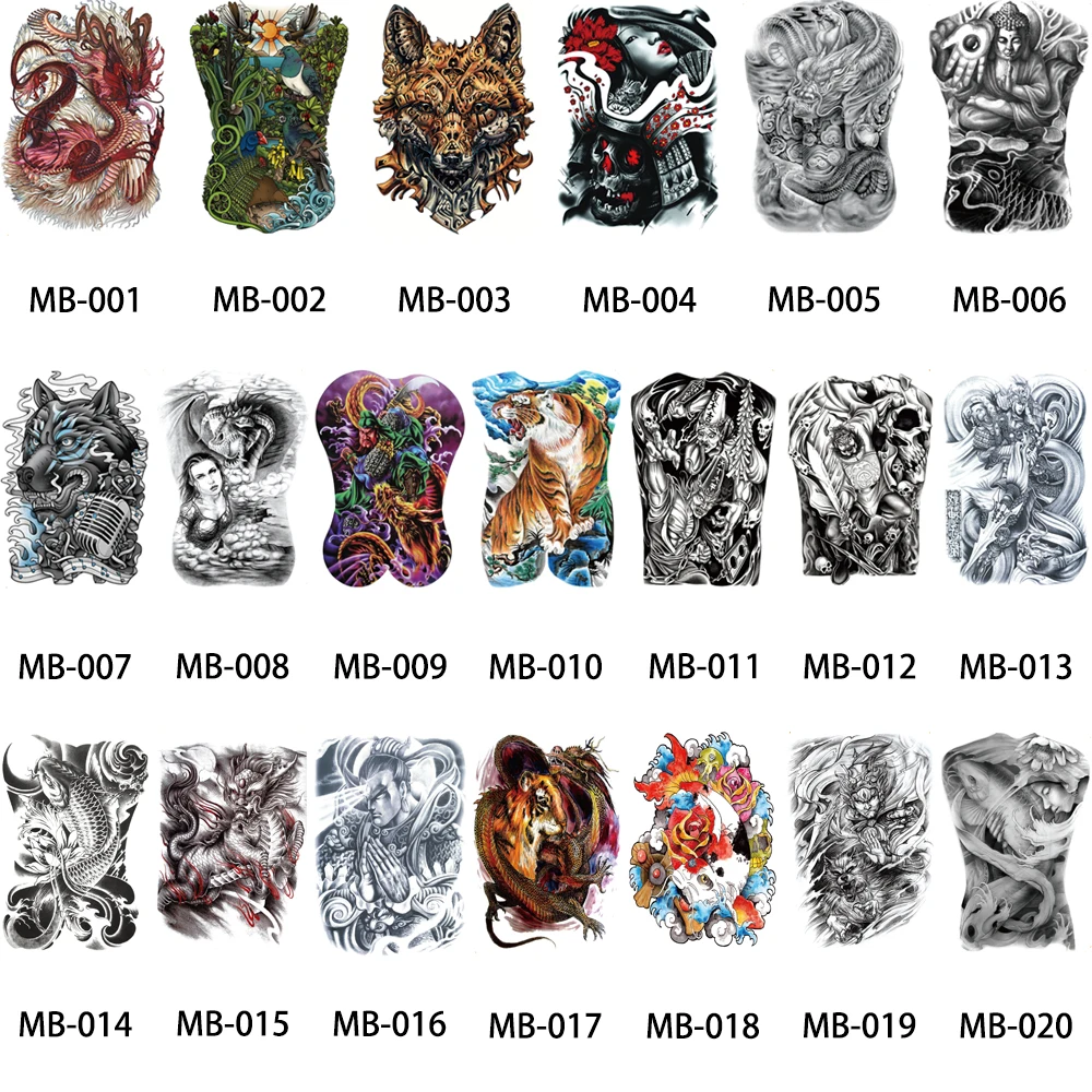 1 лист наклейки, большая наклейка на всю спину, грудь, с изображением волка, тигра, дракона, 20 образцов рисунков боди-арт, водостойкие тату для мужчин и женщин