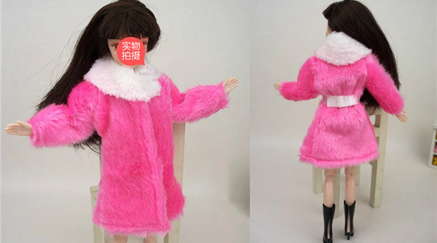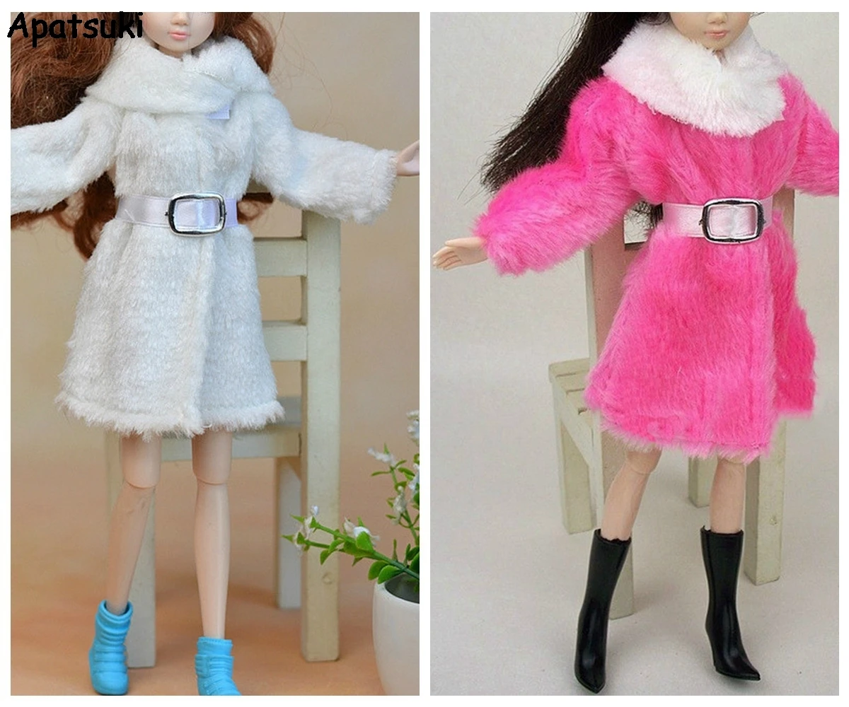 Детская зимняя теплая одежда, розовая шуба, мини-платье для кукол Барби, с поясом, аксессуары для игрушечной куклы