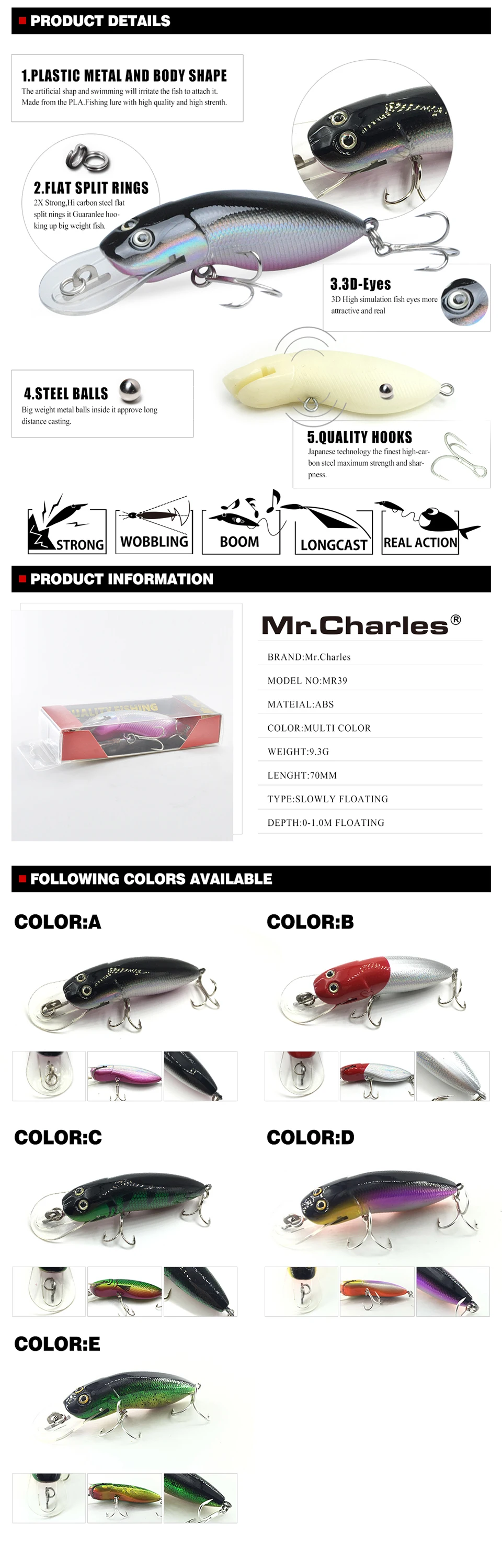 Приманка рыболовная Mr.Charles MR39, 70 мм, 9,3 г, 1 шт., твердая, плавающая, с 3d-глазами, для 0-1,0 м