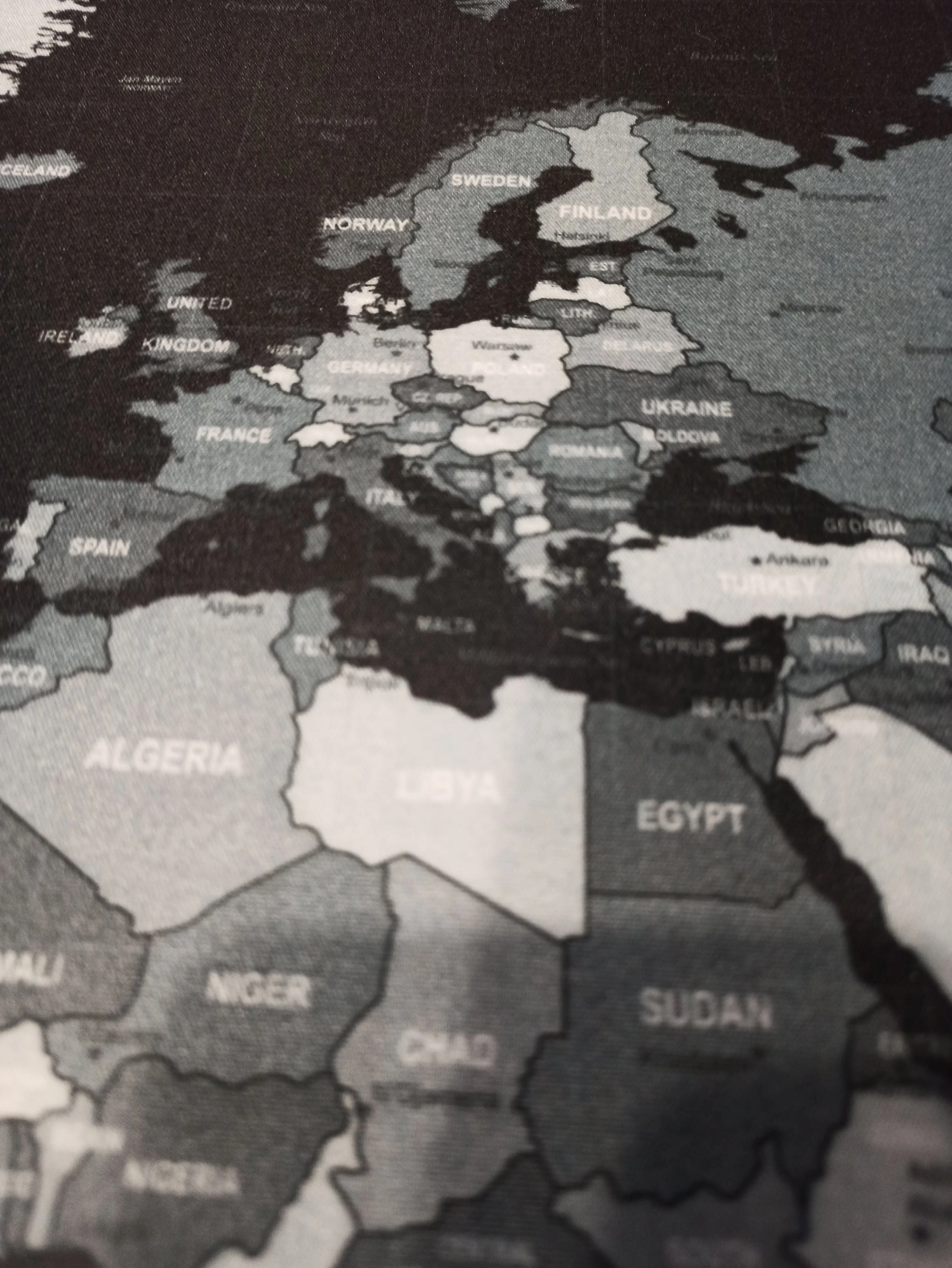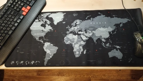 Коврик отличный. Изображение в порядке, но обратите внимание, что белый текст на светло-синем и черном текстах на темно-синем цвете трудно отличить. Разрешение печати в порядке, но столица загружены в очень маленький шрифт, и некоторые из них могут быть очень трудно читаются. Я купил его, чтобы смотреть на формы и названия стран, пока не узнаю их, и мне не придется читать названия, так что это нормально для меня.