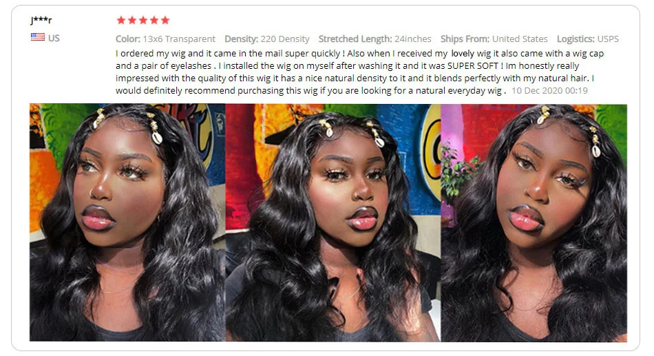Package shipped the next day and I received it faster than I expected. The wig is soft, wave pattern is pretty and true to length. The bag is super cute and they even include little gifts.