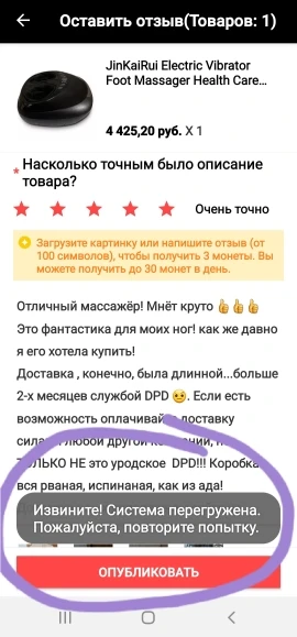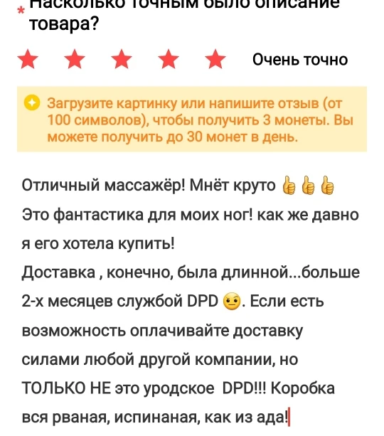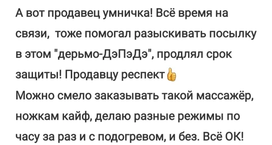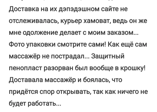 Ужасное общение с продавцом и ещё больше ужаснее, так это доставка. Товар шёл более двух месяцев до моего города. Но когда он прибыл в мой населённый пункт, приключения только начались. Курьер, не хотел доставлять товар, со мной просто никто не связывался. Обращения к продавцу никак не помогали, просто отвечал заготовленным шаблоном. Но как я пригрозила открыть спор, алилуя, со мной связался курьер, и обещал привезти товар на следующий день, но не привёз и не брал трубку. Потом все повторялось пять раз!!!!! Угроза спора - звонок от курьера - затем игнор. И чудо, на шестой раз, спустя 2 месяца и две недели мне доставили заказ. К слову массажёр был помят и поцарапан, но я уже была рада и такому. Мой вам совет, не заказывайте ничего у этого продавца, не портите себе нервы, просто закажите у любого другого продавца, на али сотни подобных лотов с массажером. Спасибо, у меня все.