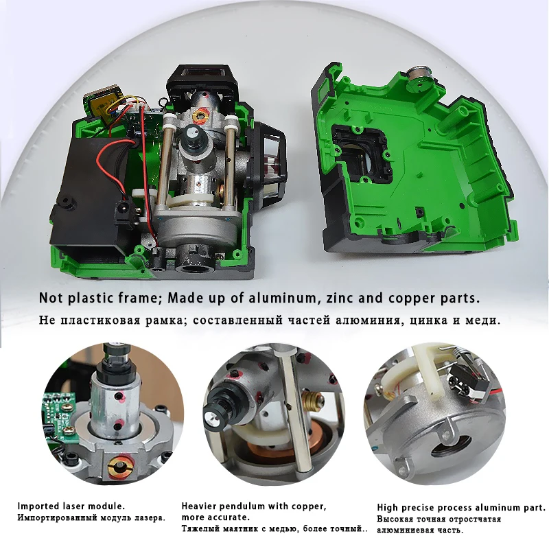 1) не пластиковая рама; Изготовлен из алюминия, цинка и меди.2) импортный лазерный модуль.3) более тяжелый маятник с медью, более точный. Вес нетто линейного лазера: 746 г4) Высокоточная технологическая алюминиевая часть.
