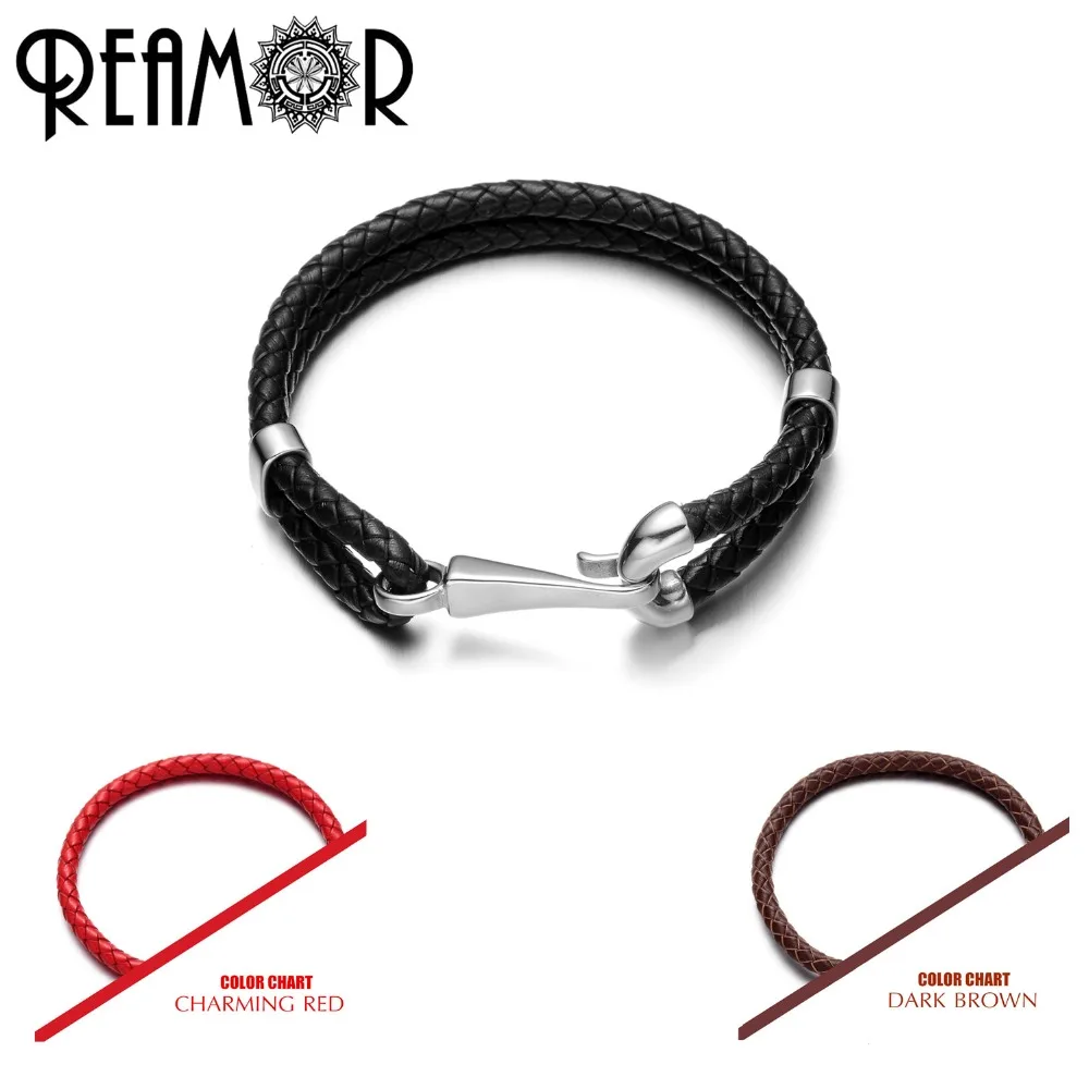 Браслет REAMOR 316l из нержавеющей стали серебристого цвета с крючками-рыбками, двойной плетеный кожаный браслет, модные мужские ювелирные изделия