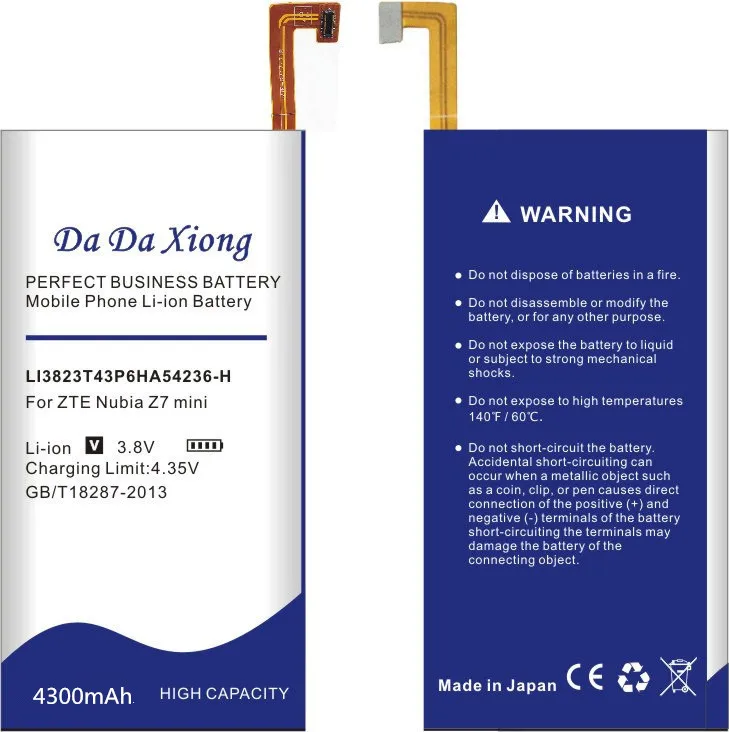 100% Оригинальный Da Xiong новый и высококачественный аккумулятор. Емкость:4300 мА · ч Напряжение: 3,8 V Тип: li-ion Совместимость: дляZTE Nubia z7 mini Z7 mini NX507J Blade S6 5,0 дюймов G717C G718C Безопасность и окружающая среда: двойные функции защиты. Двойная электрическая плата IC и PCB защищают от разрядки заряда и короткого замыкания. Наша батарея того же размера с оригинальной батареей. Два года гарантииПосылка включает в себя: