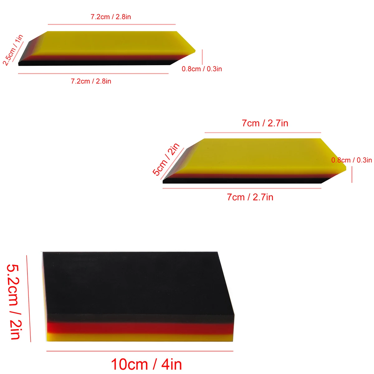 Упаковка: резиновый скребок 10 шт. Материал: резина PPF Цвет: желтый, красный, черный Размер: 1*3,1 дюйма (2,5*8 см) 2*3,1 дюйма (5*8 см) 4*2 дюйма (10*5,2 см) Мягкость: Желтая сторона-75 дюрометр Красная основа Черная сторона-85 дюрометр Особенность: 1. Две стороны для двух дюрометров ---- есть две разные мягкости: дурометр 75 ° и 85 °, которые могут удовлетворить различные требования к обертке. 2. Мягкий резиновый материал PPF защищает поверхность от оставления следов во время работы. Он также долговечен для более длительного срока службы. 3. Несколько разрезов: 4-дюймовый скребок с разрезом 30 градусов, что полезно для обертывания углов. Применение: 1. Виниловые инструменты для установки, строительные инструменты, промышленные инструменты, комплекты инструментов для наклейки на автомобильную пленку, инструменты для стайлинга автомобиля, инструменты для оттенков окон. 2. Оконная вода инструмент для протирки стекла, Быстросохнущий скребок для стеклоочистителя. 3. Аксессуары для мытья окон лобового стекла автомобиля. 4. Инструменты для чистки дома, офиса. 5. Удаление старой пленки и клея. 6. Инструмент для удаления воздушных пузырьков для установки защитной пленки.