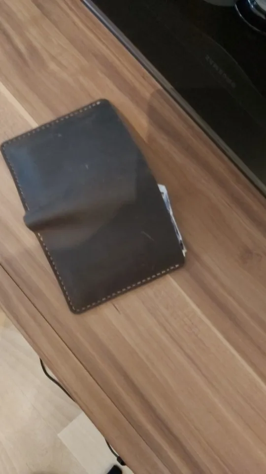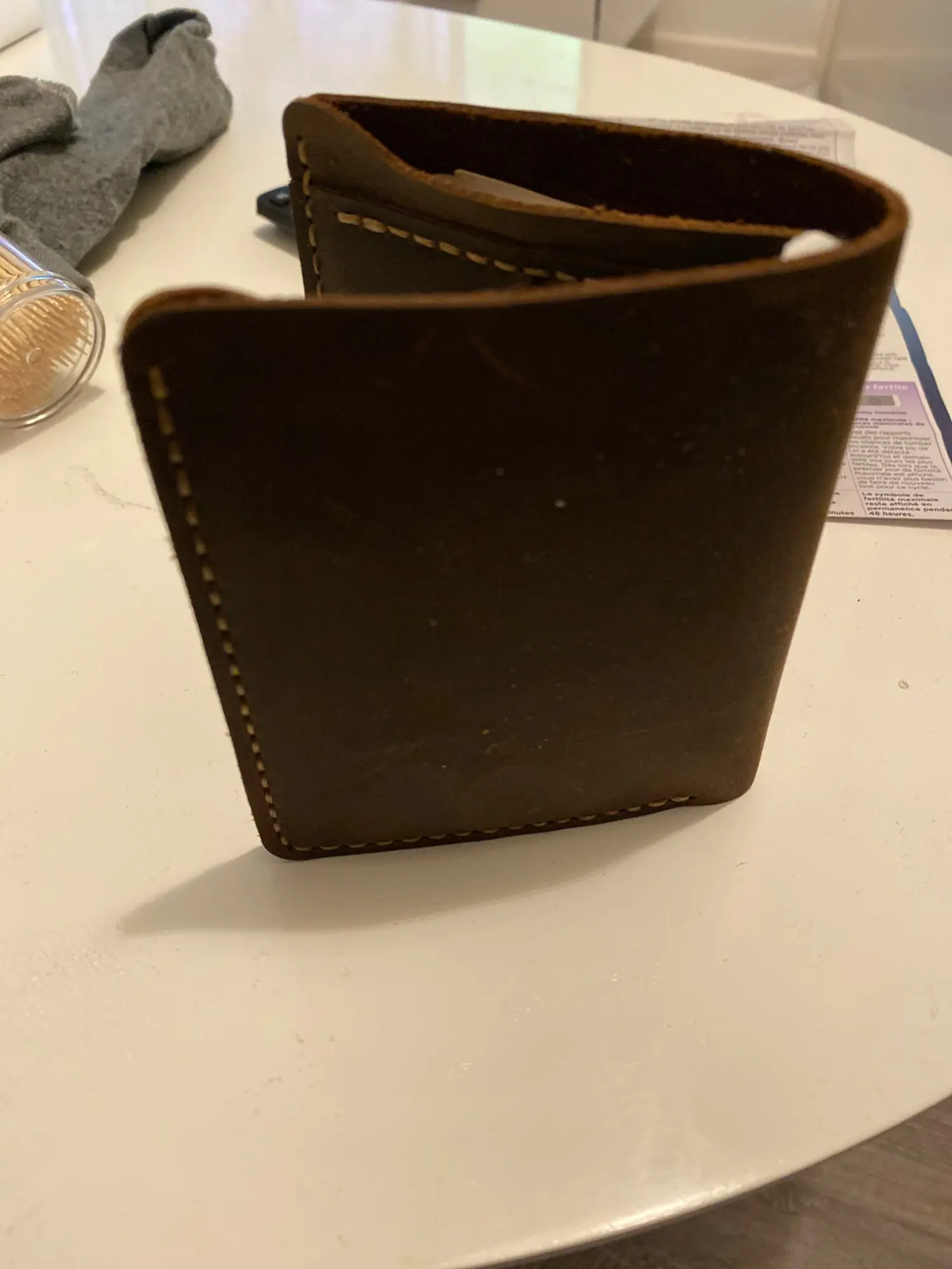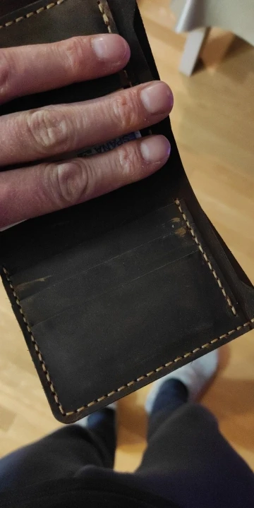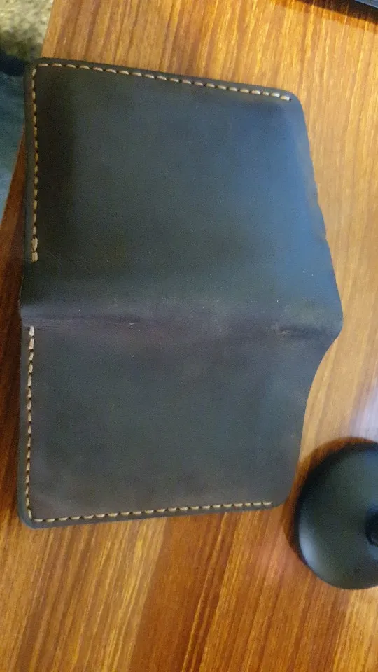 Кошелек из толстой кожи. Царапины затираются. Немного больше, чем я думал. Мне нравится.