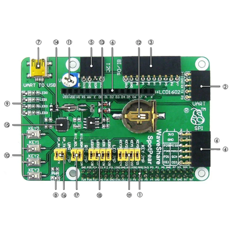 Клещи для соединения с RPiИнтерфейс UART: легко подключается к модулям UART, таким как RS232, RS485, USB-UART и т. д.Интерфейс 8I/Os: легко подключается к модулям, управляемым I/Os, таким как 8 кнопок, преобразователь логического уровня, Смешанная Плата и т. д.Интерфейс SPI: легко подключается к модулям SPI, таким как AT45DBXX Dataflash, L3G4200D Board и т. д.Интерфейс I2C: легко подключается к модулям I2C, таким как плата расширения PCF8574, плата PCF8563 RTC, плата LSM303DLHC и т. д.Символьный ЖК-интерфейс: для отображения символа LCD s, как LCD 1602USB-порт: USB в UART, поддерживается встроенным преобразователем CP2102Индикатор питанияСветодиоды пользователяПользовательские ключиПотенциометр: для регулировки контрастности LCD1602Держатель аккумулятор RTCPCF8563: Встроенный чип RTCКристалл 768K: кристалл RTCCP2102: Встроенный чип USB в UART для отладкиПеремычка CP2102Джемпер RTCПеремычка для светодиодовПеремычка с клавишами пользователяДля джемперов выше: