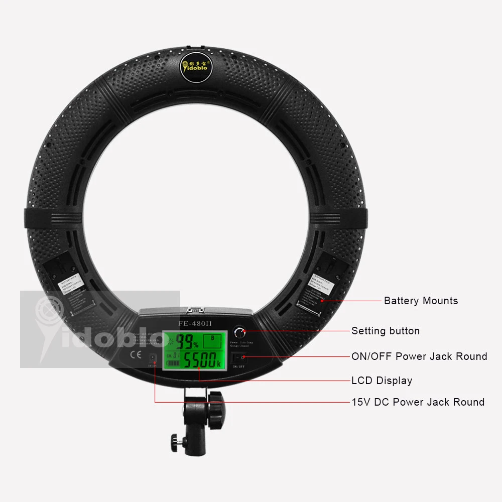 FE серия состоит из высоко яркая SMD светодиодный Чипсы, срок службы до 50000 часов. Эта серия является более эффективной и энергосберегающей, даже может достичь наименьшего уровня потери светильник. Работает с двумя Sony F750/970 батареи (14,5 V) или адаптер переменного тока (110V-220V). Регулируемая Цветовая температура от 3200-5500K. Серия FE подходит для наружной съемки. Персонажи и свадебные фотографии, освещение для макияжа и студии.Особенности:1) светодиодный кольцевой светильник, более высокий CRI: более 95RA, затемнения 10%-100%, без мерцания2) умный и компактный дизайн, легко носить с собой.3) супер ЖК-экран, чтобы показать выходную мощность, цветовую температуру, канал, пульт дистанционного управления опционально для легкой работы.4) используется высокотехнологичный импортный светодиодный светильник с более чем 50000 часов работы.5) подходит для внутренней и наружной фотографии и видеосъемки, портретной и свадебной фотографии, интервью и т. Д. Особенно удобно для детской фотосъемки.Характеристики:Модель: FE-480Цветовая температура: 3200K-5500K ± 200K (двухцветная плавная регулировка)Новый дизайн: ЖК-экран, пульт дистанционного управления, Встроенный приемникМощность: 96 Вт (480 светодиодов)Напряжение: 110-220 В переменного тока/15 В постоянного тока/два аккумулятора SONY 750/970Световой поток: 3300 Lux/0,5 m, 1000 Lux/1 мИндекс цветопередачи: 95RAСветильник угол: 60 градусовЭффективное расстояние: 30 метровРасстояние управления: 50-80 метровРазмер: внешний диаметр: 18 дюймов/45 смПосылка включает в себя: