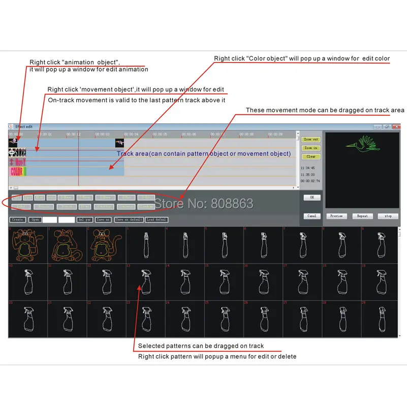 Программное обеспечение может редактировать содержимое:Работает со всеми лазерами ILDA (красный, зеленый, синий, RGB или полный цвет), линиями и фигурами рисования; Позиционирование, размер, изменение, воспроизведение, изменение последовательности; Добавление, удаление, сохраните, скопируйте, сохраните, сохраните, скопируйте, скопируйте и так далее.